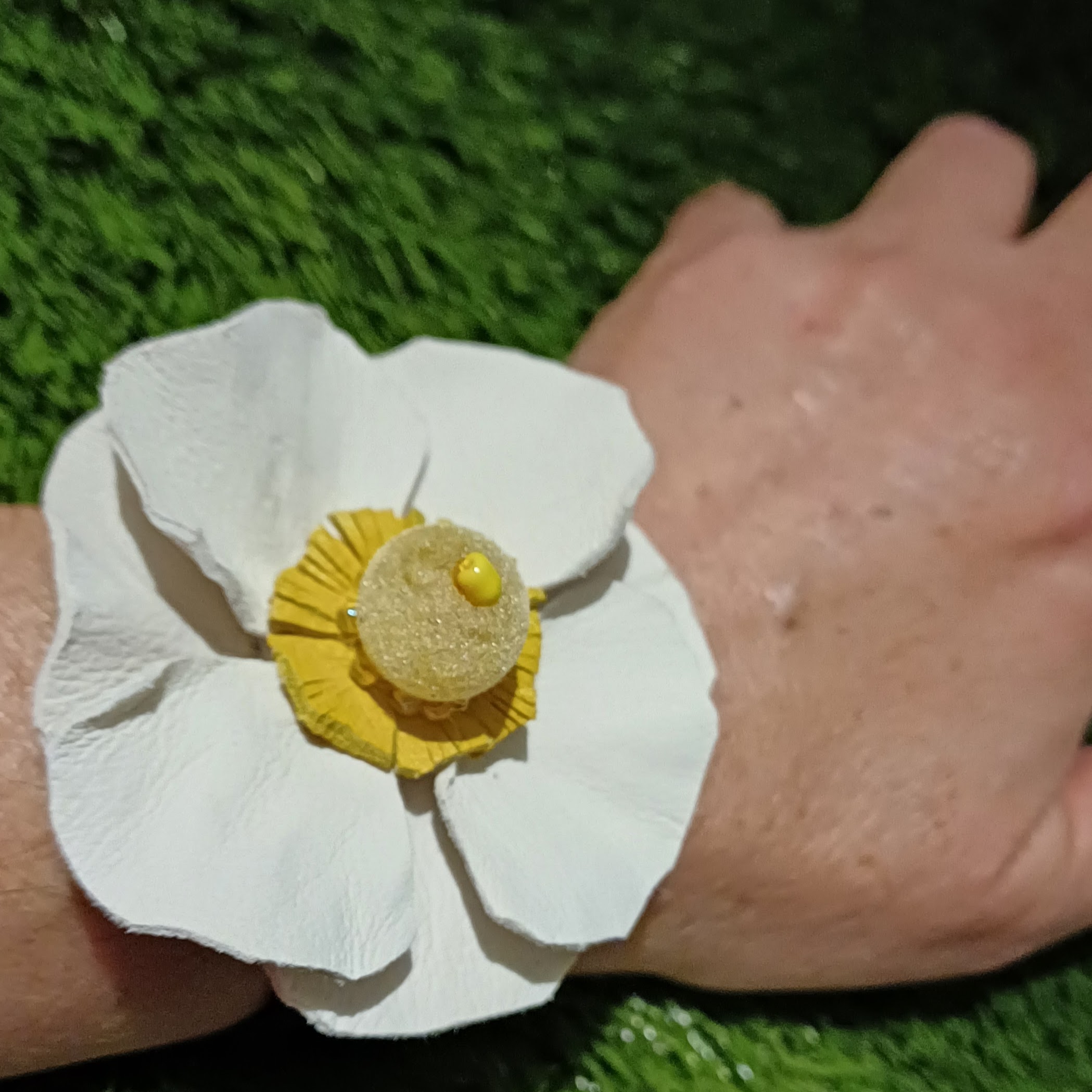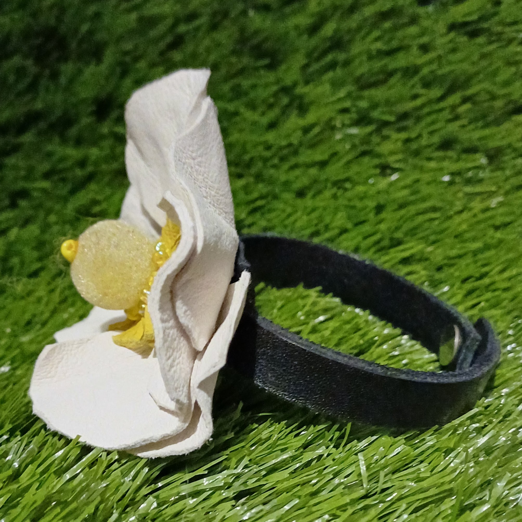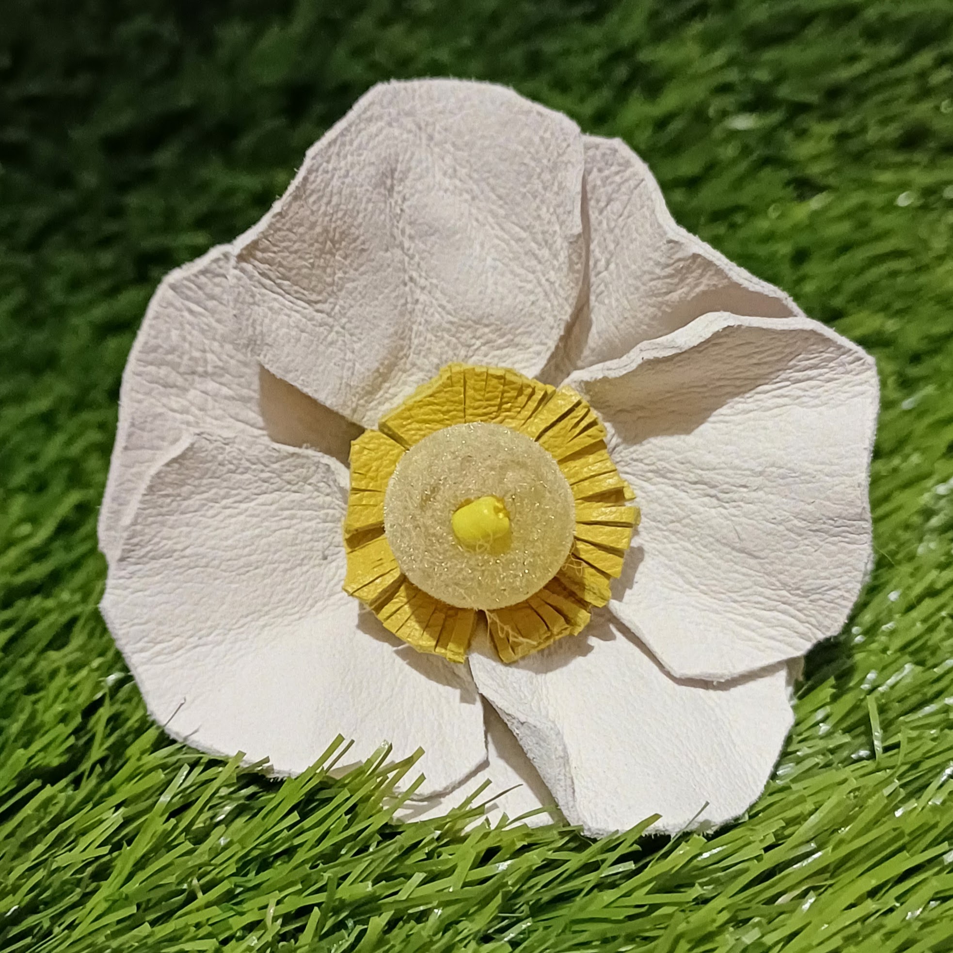 Fleur en cuir d’agneau et cuir de veau, perle fantaisie floconnée, perles de rocailles.
