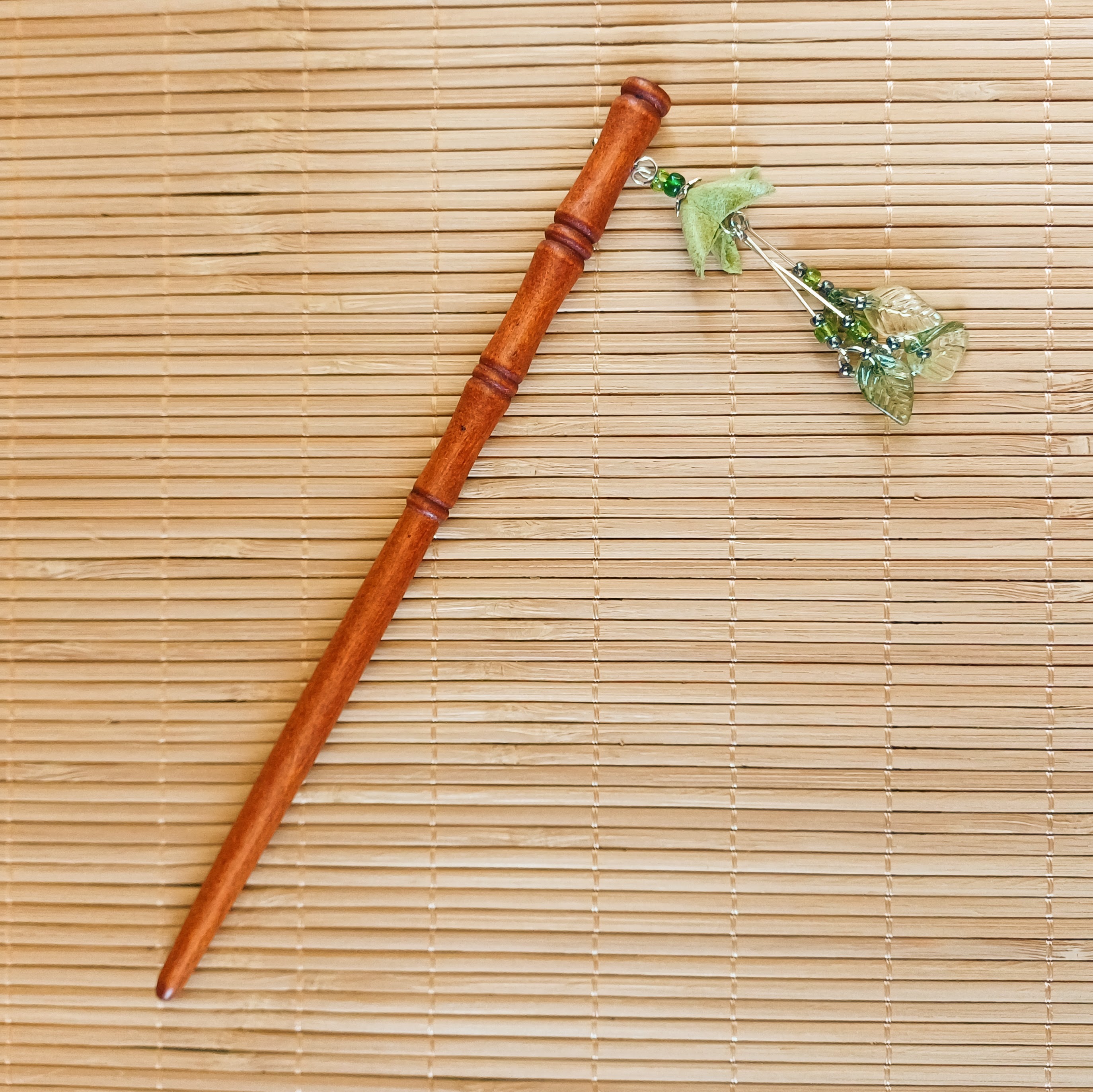 Fleur en cuir, perles fantaisies en acrylique, perles de rocailles, apprêts en métal sans chrome ni nickel.