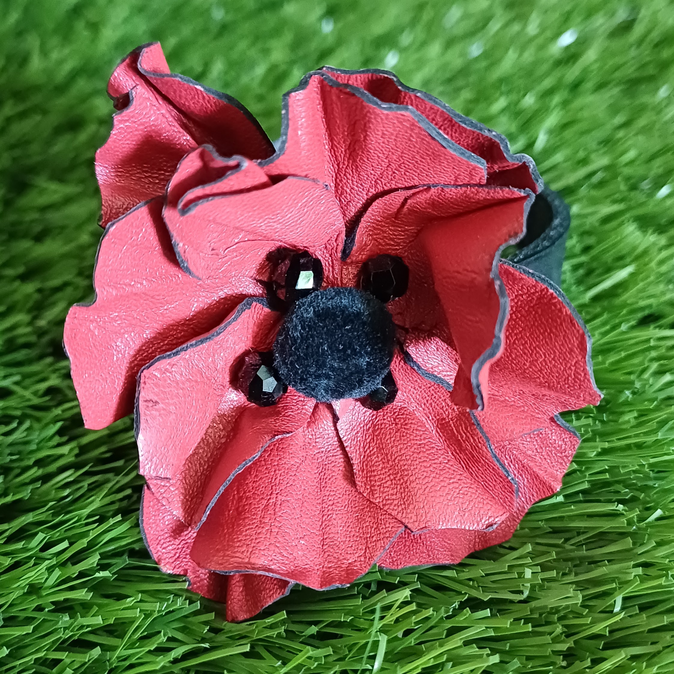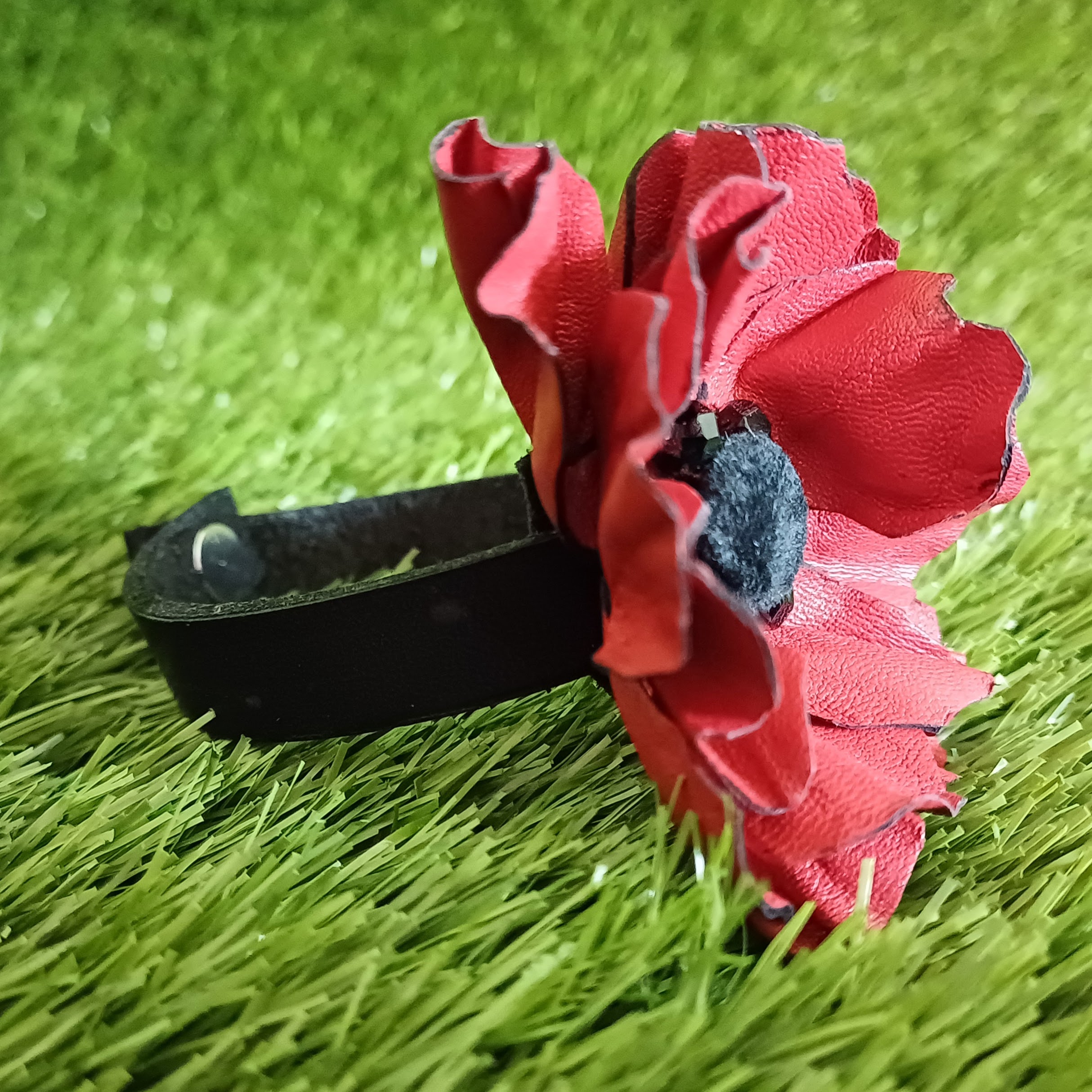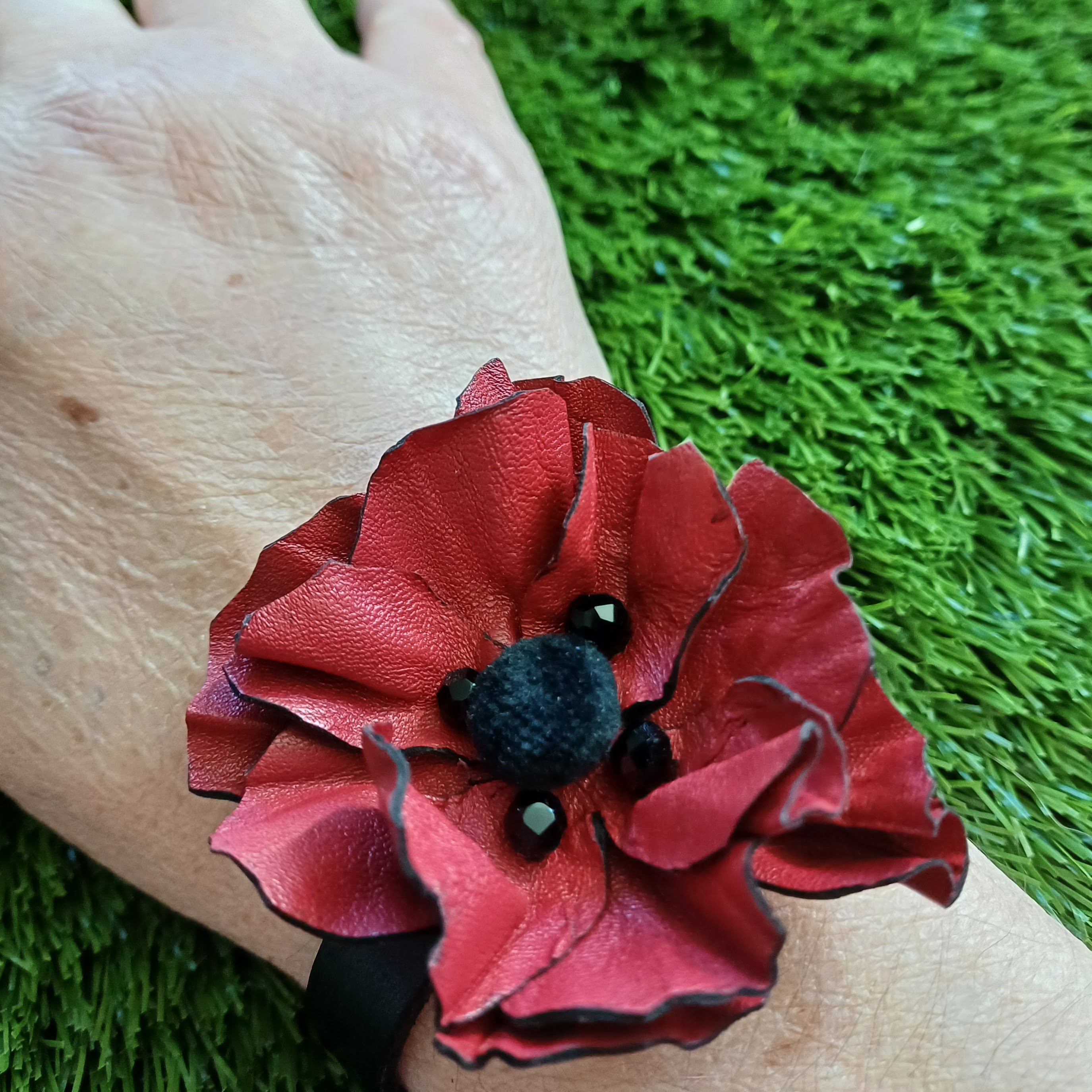 Fleur en cuir d ‘agneau, bouton velours, perles multifacettes en verre, posca.
