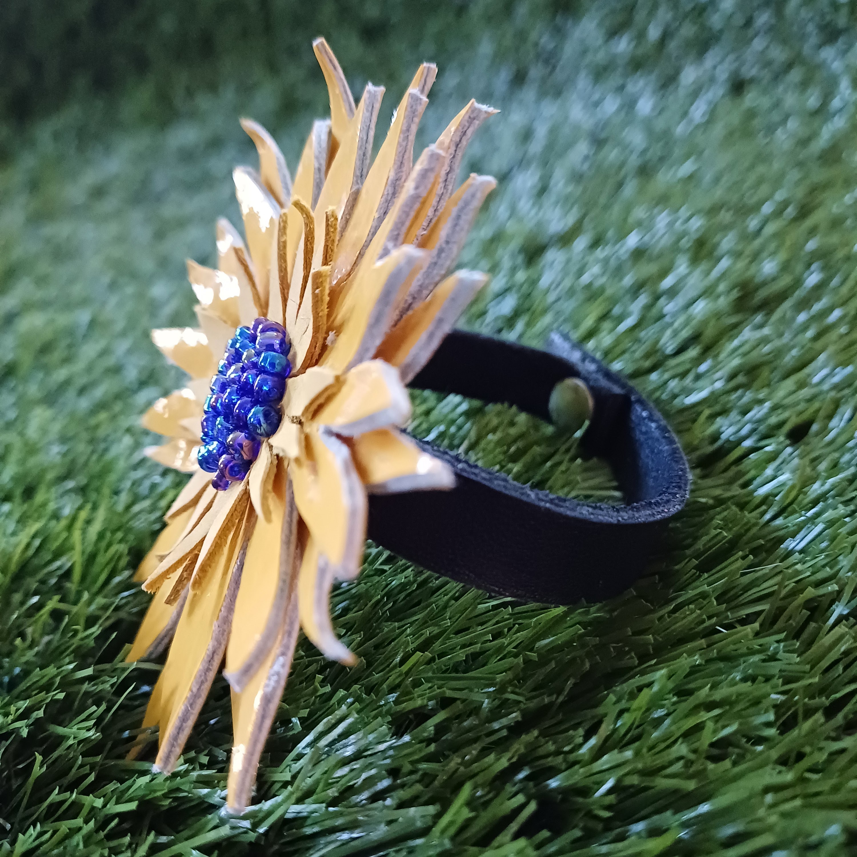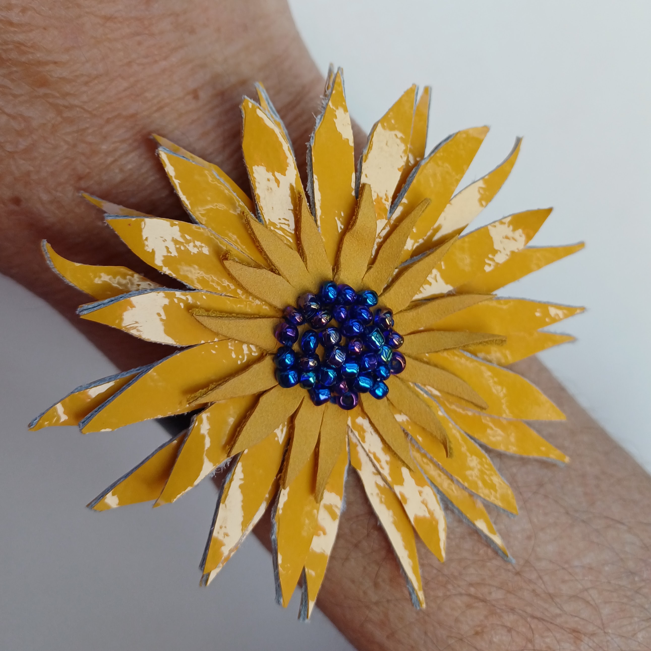Fleur en cuir de veau vernis, perles de rocailles.
