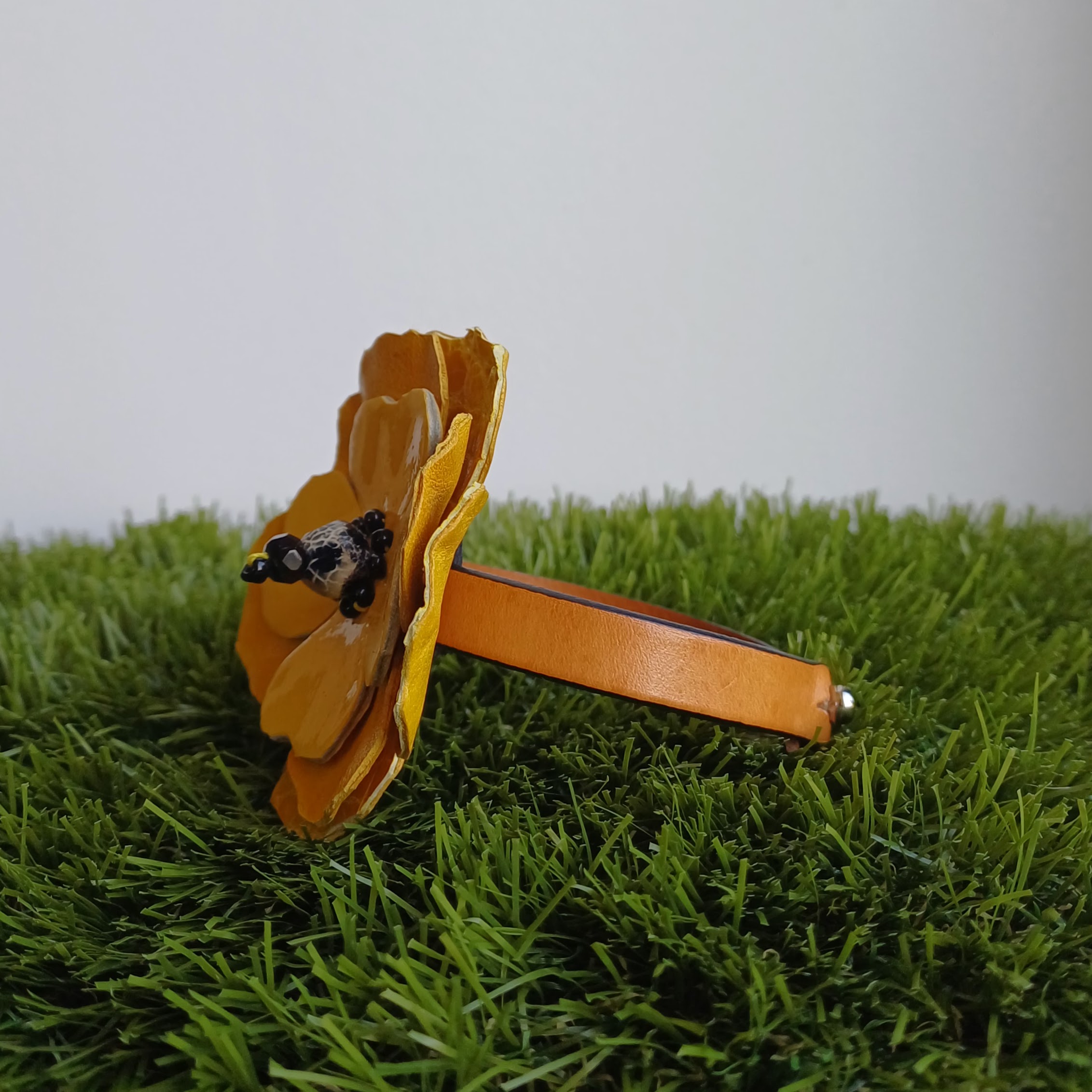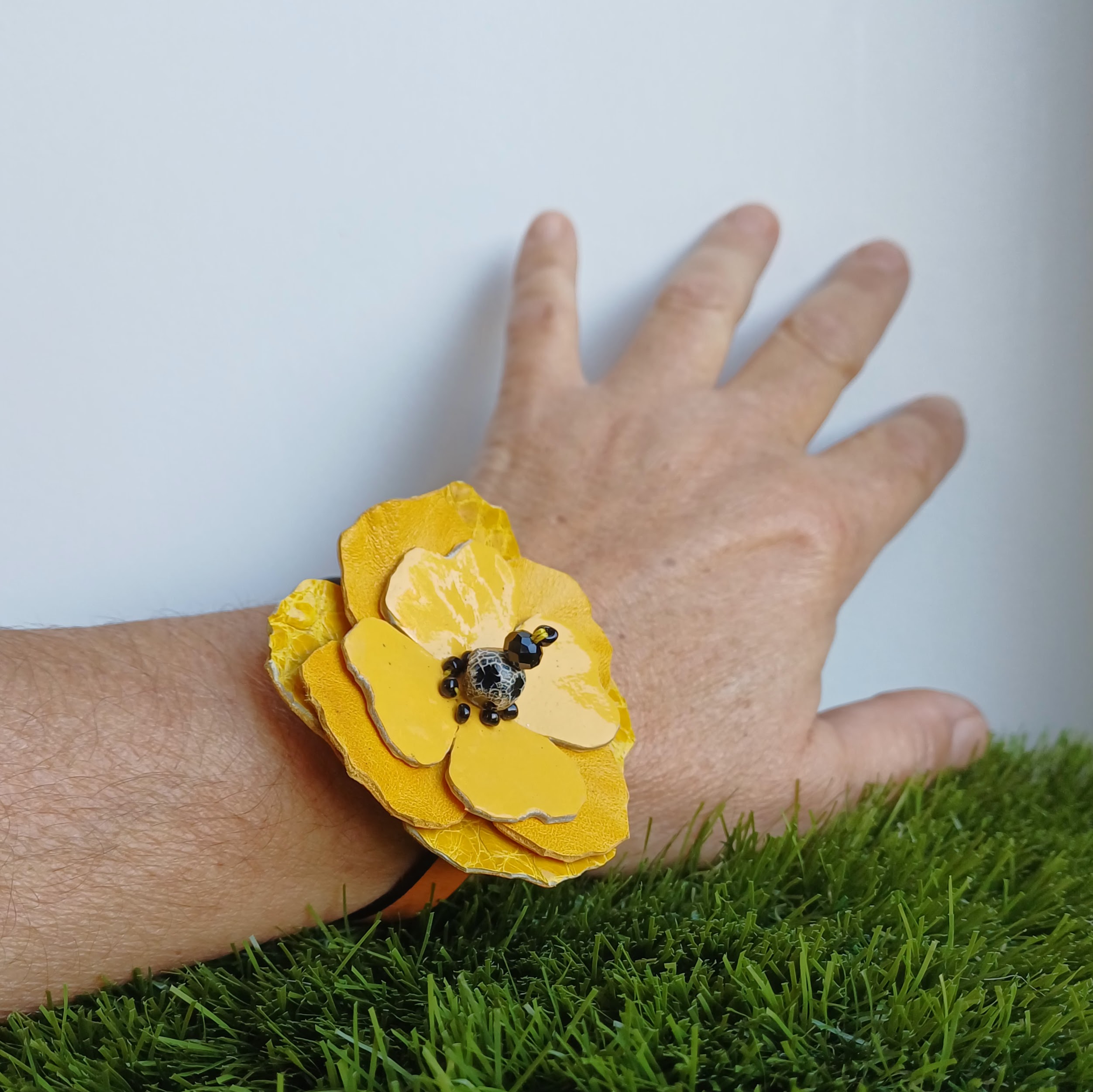 Fleur en cuir de veau vernis, cuir croco, cuir de vachette, perle multifacette, en verre,perles de rocailles et céramique fantaisie.