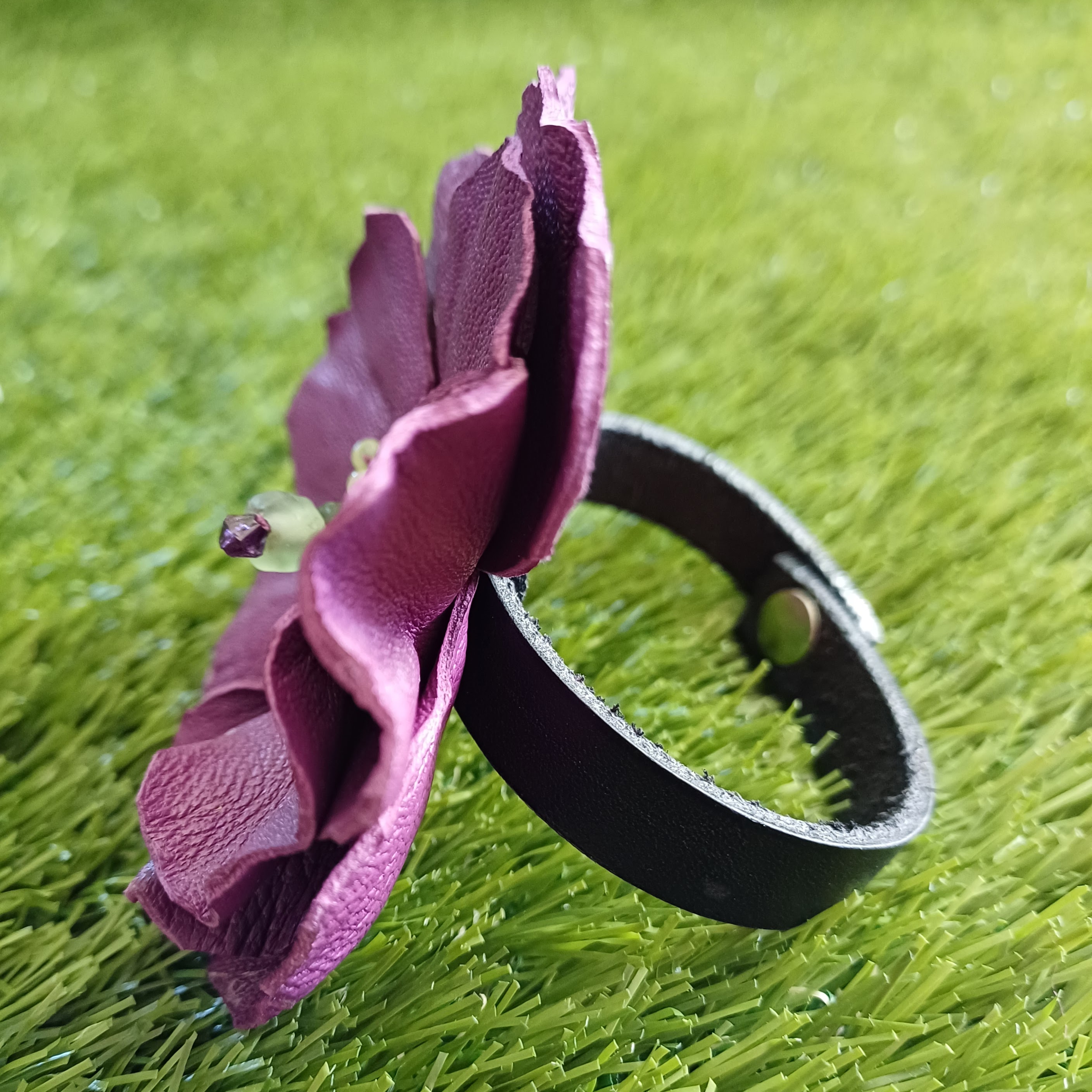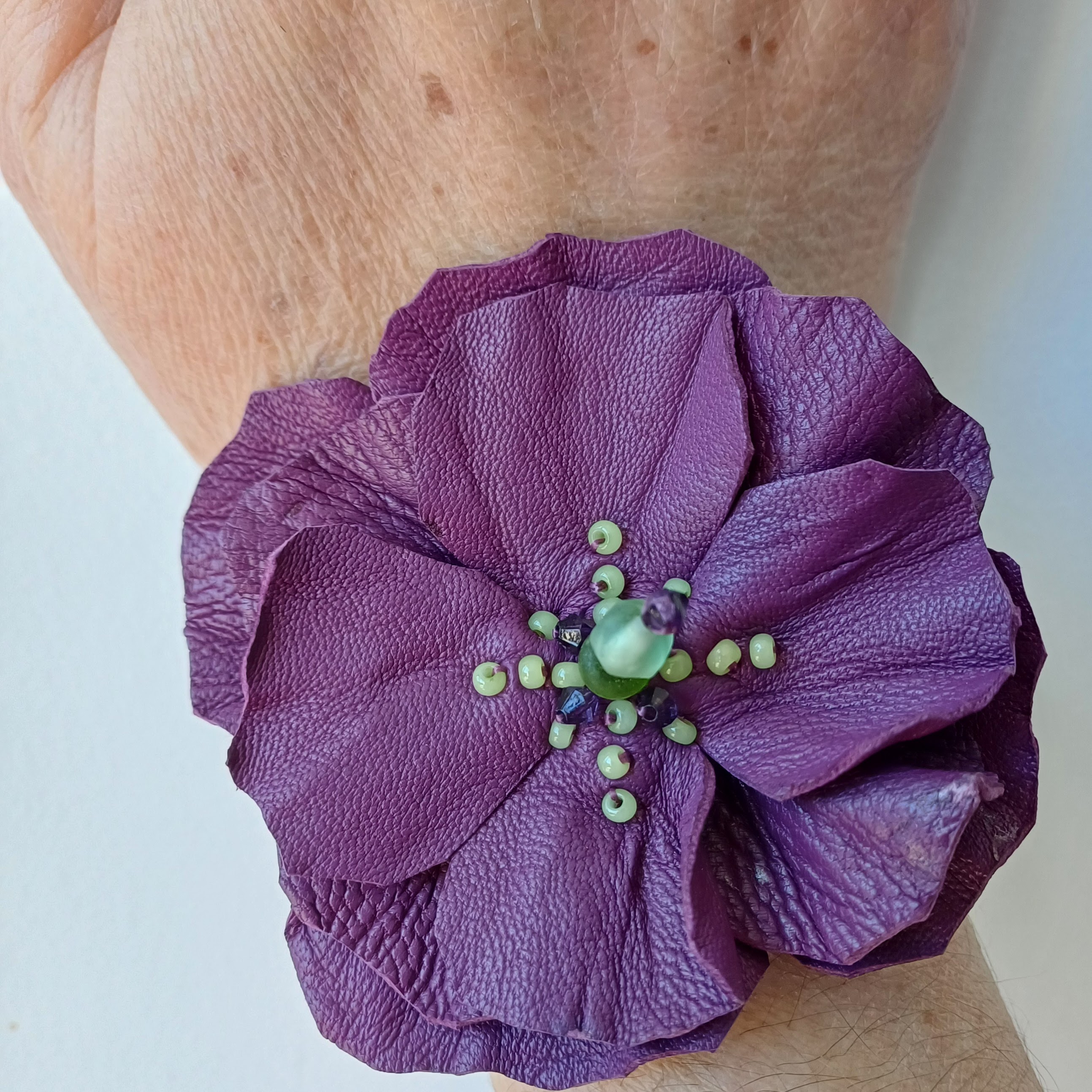 Fleur en cuir d’agneau, perles de swarovski, perle de rocailles, perles en verre poli.