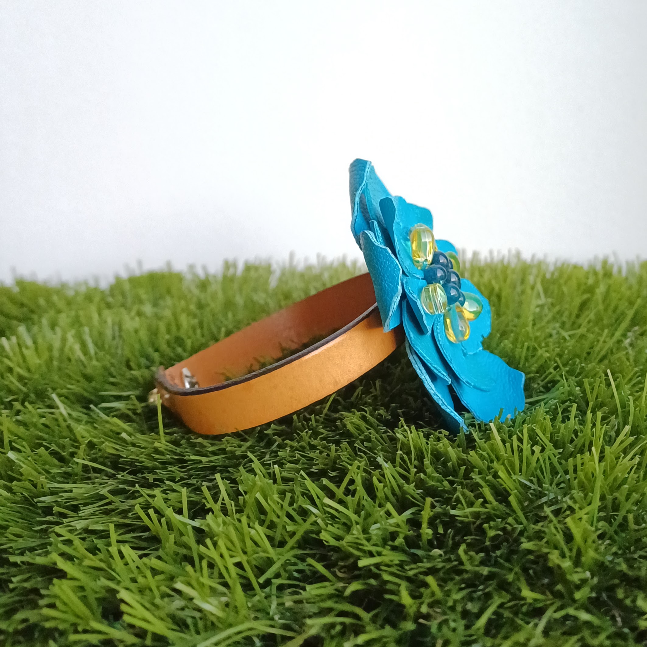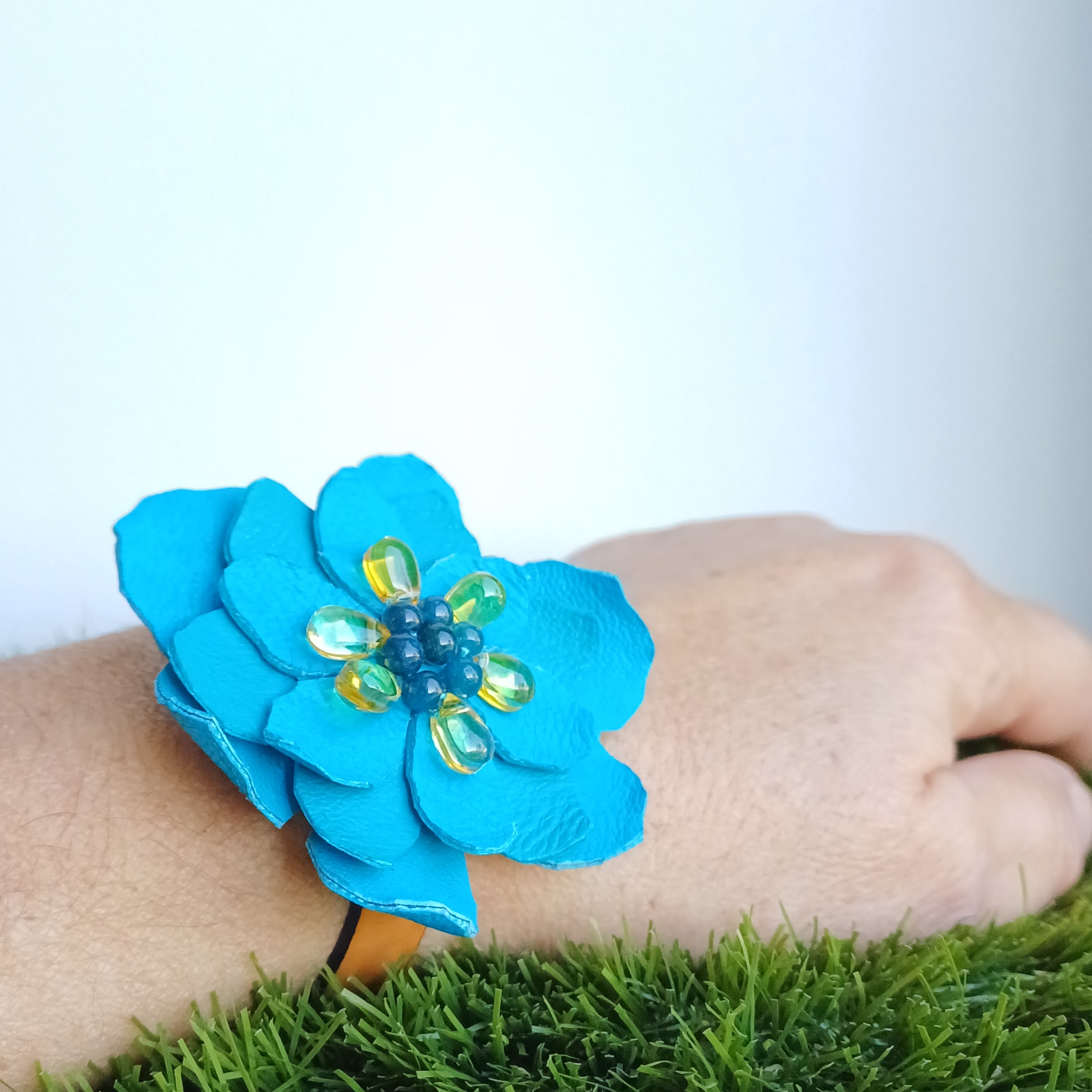 Fleur en cuir d’agneau, perles semi-précieuses, perle en verre goutte d’eau.