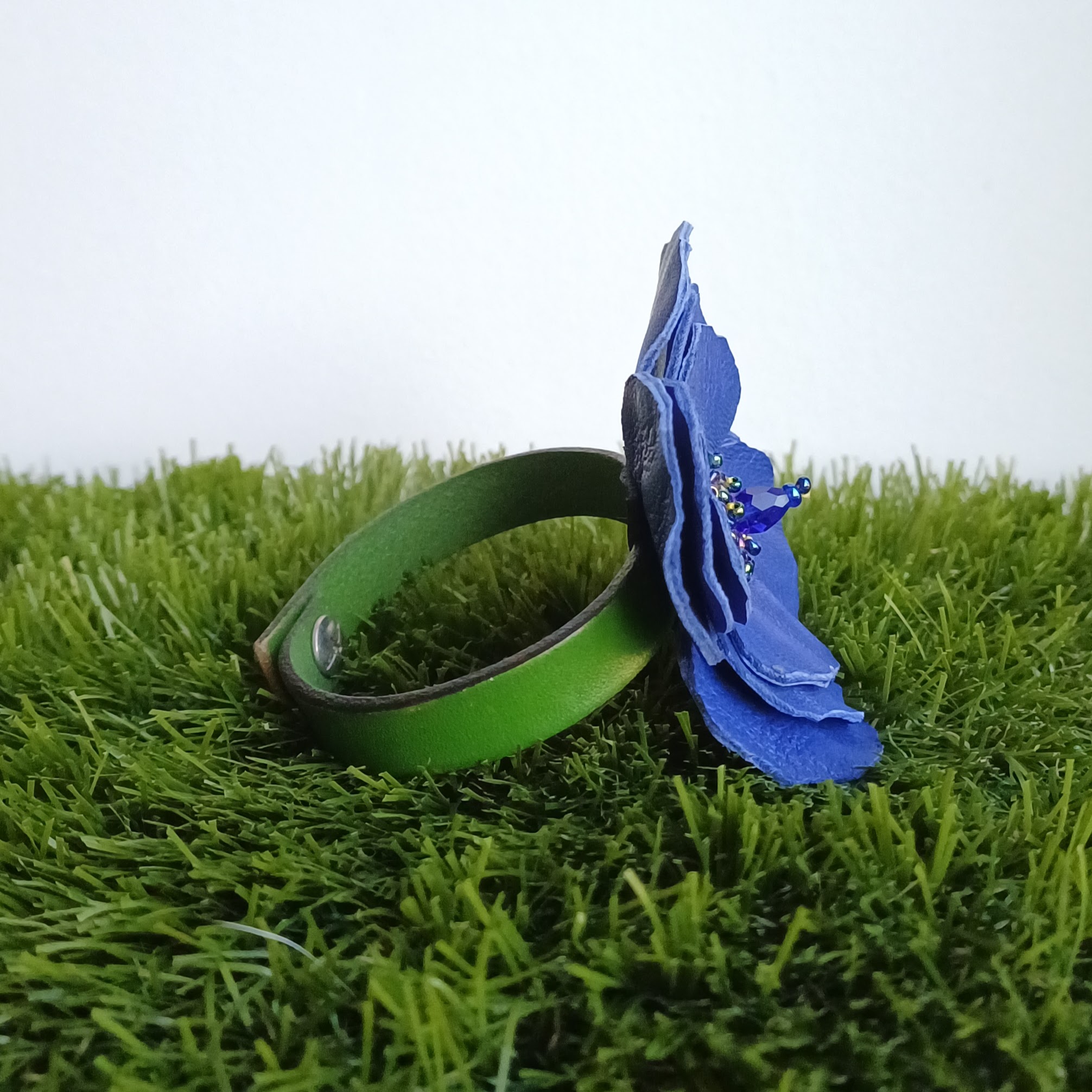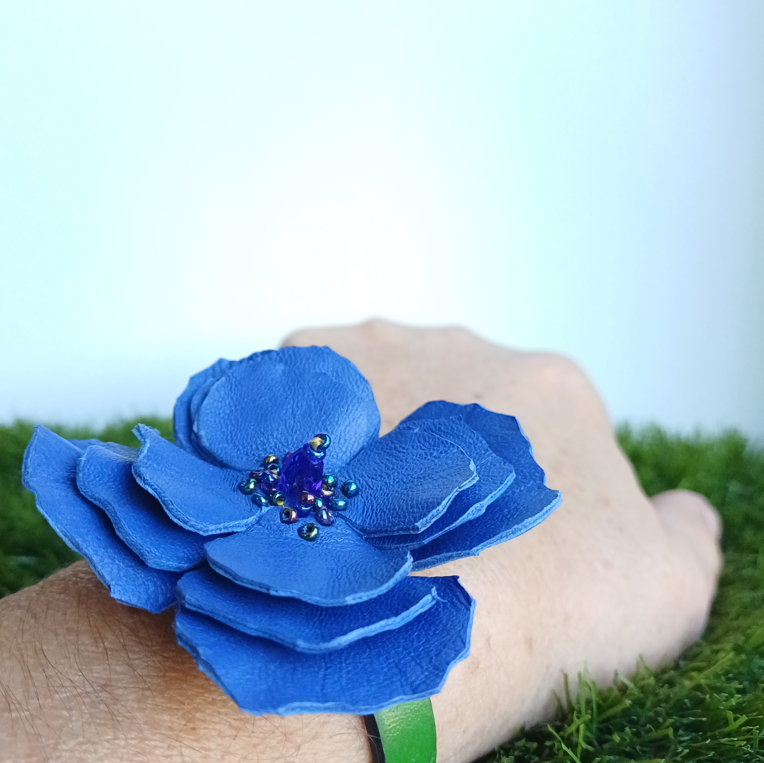 Fleur en cuir d’agneau, perles multifacette en verre et perles de rocailles.