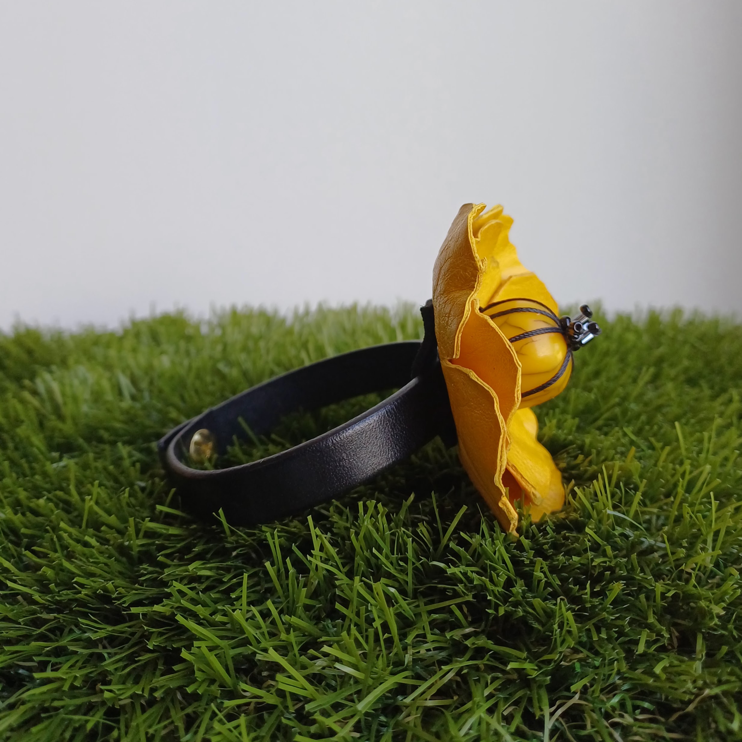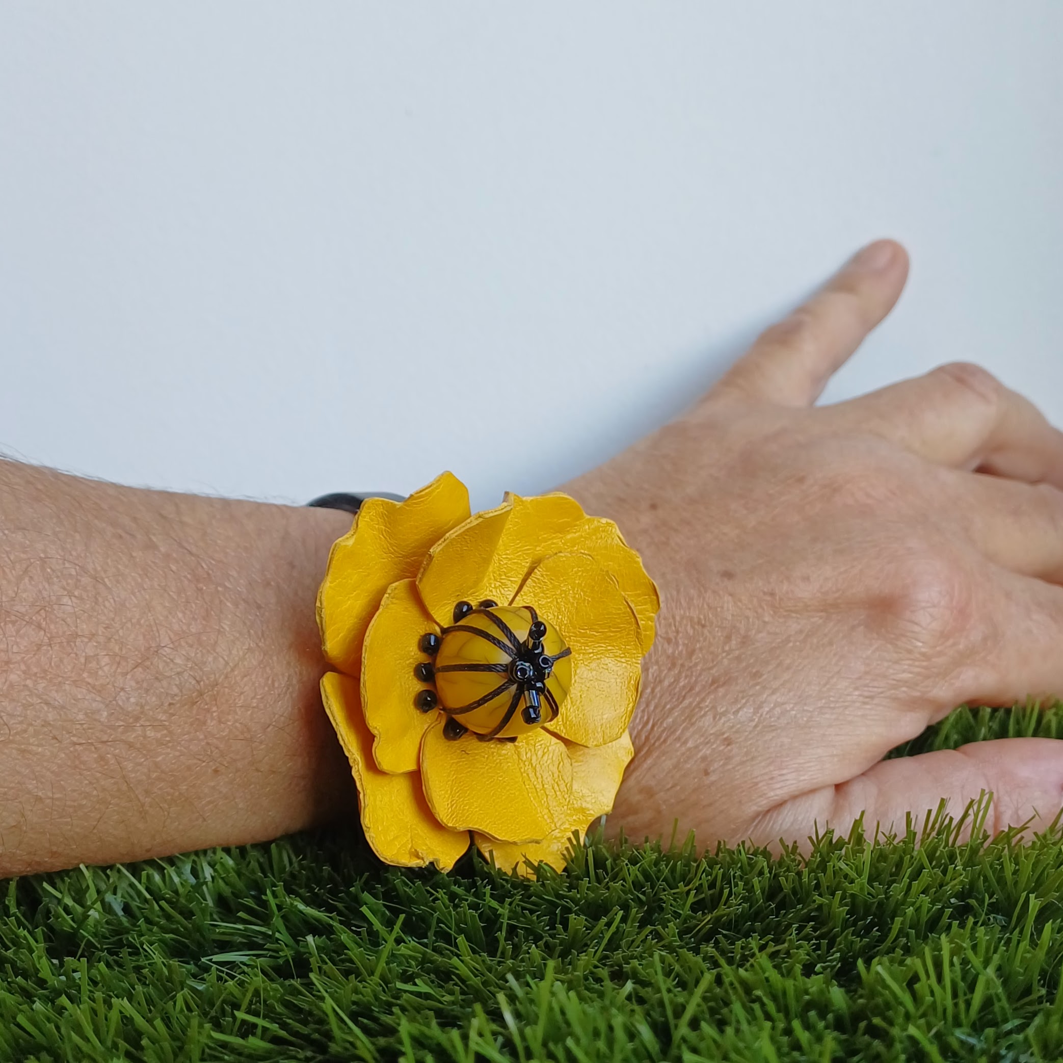 Fleur en cuir de vachette, perle résine fantaisie, perles tube en verre et perles de rocailles.