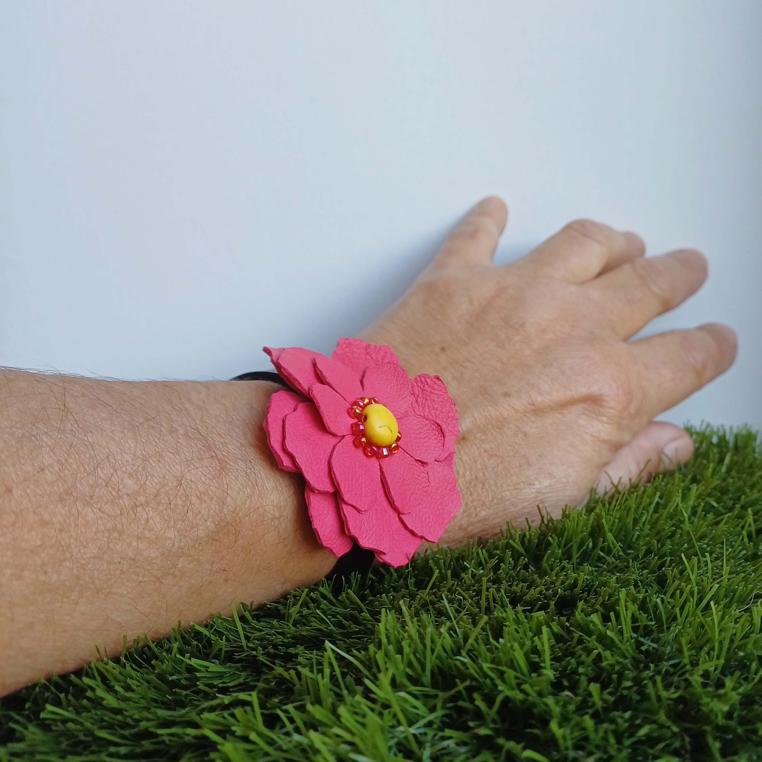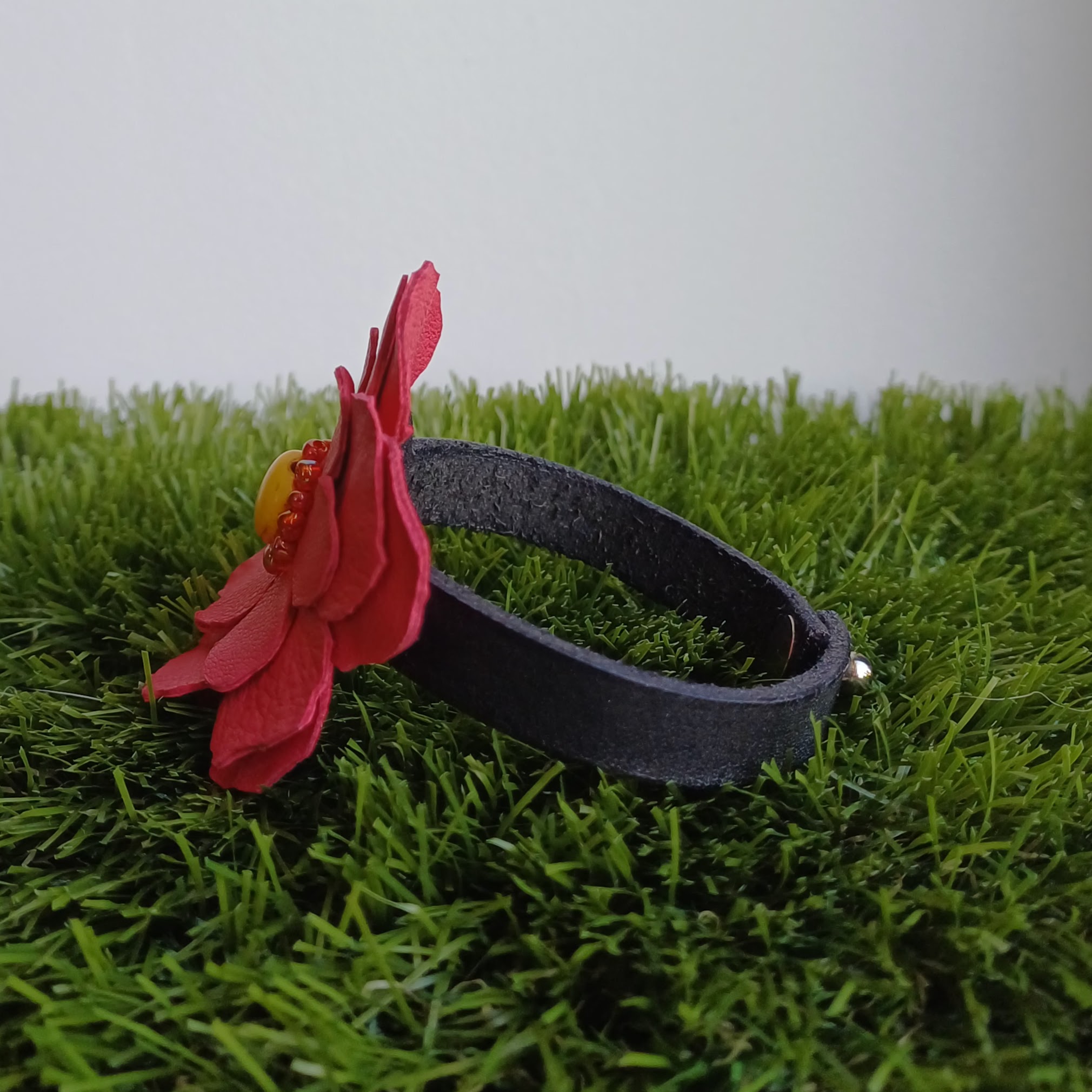Fleur en cuir d’agneau, perle fantaisie en résine et perles de rocailles.