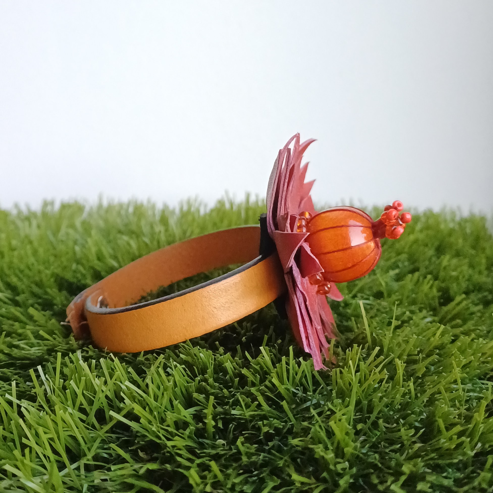 Fleur en cuir d’agneau, perles de rocailles, perle en bois et perles tube en verre.