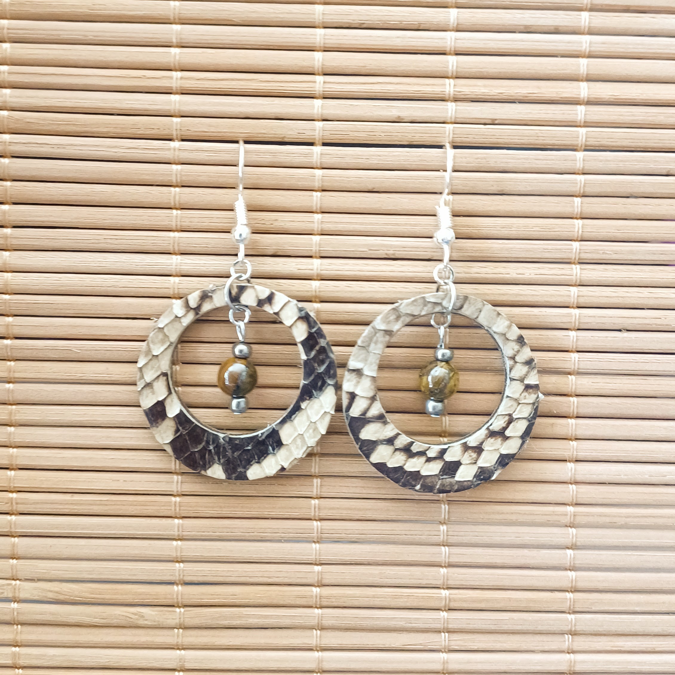 Boucles d ‘oreilles en cuir de vachette et peau de serpent, perles de rocailles et perles pierre naturelle.
