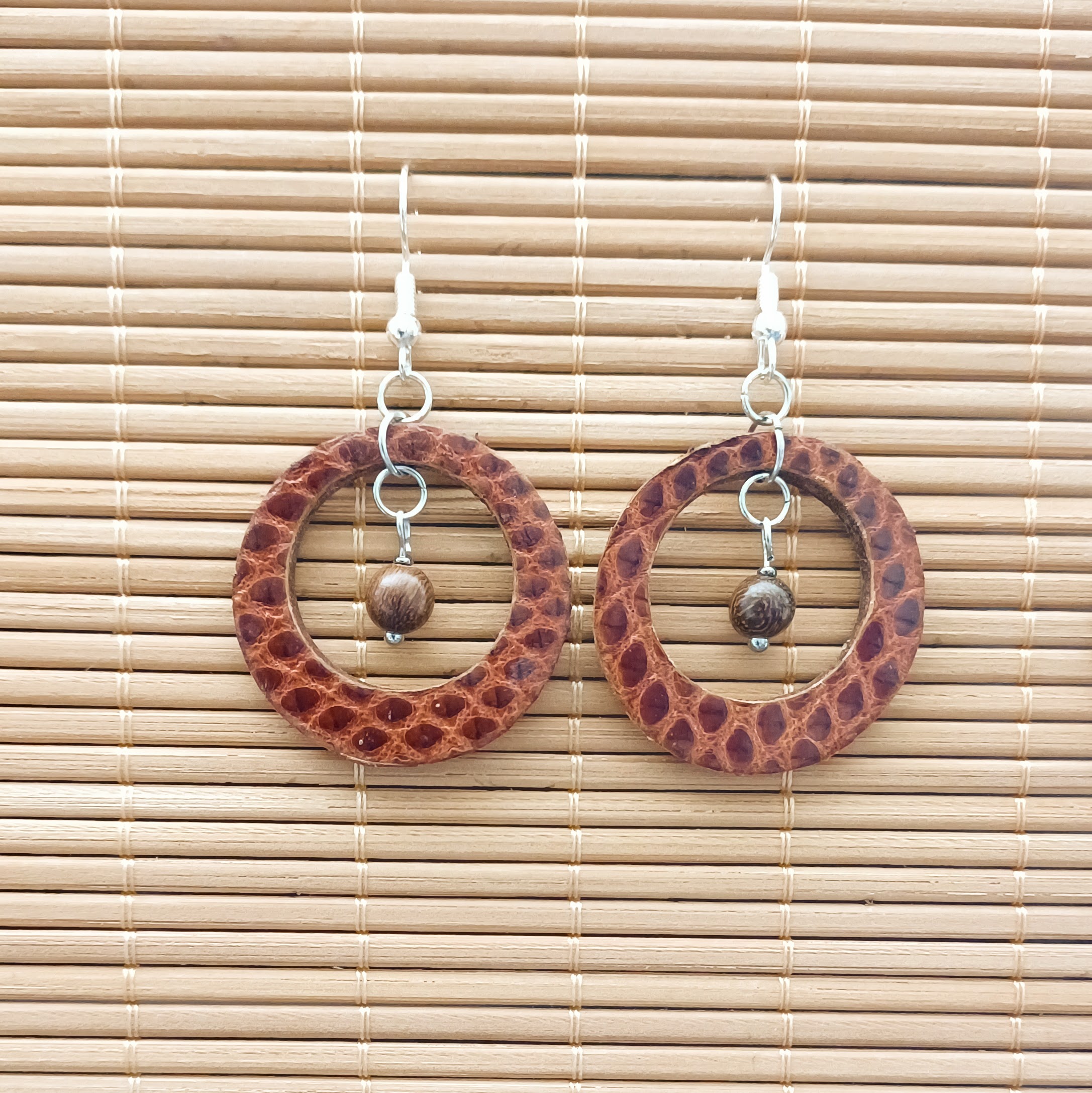 Boucles d ‘oreilles en cuir de vachette et peau de lézard, perles en bois et perles de rocailles.