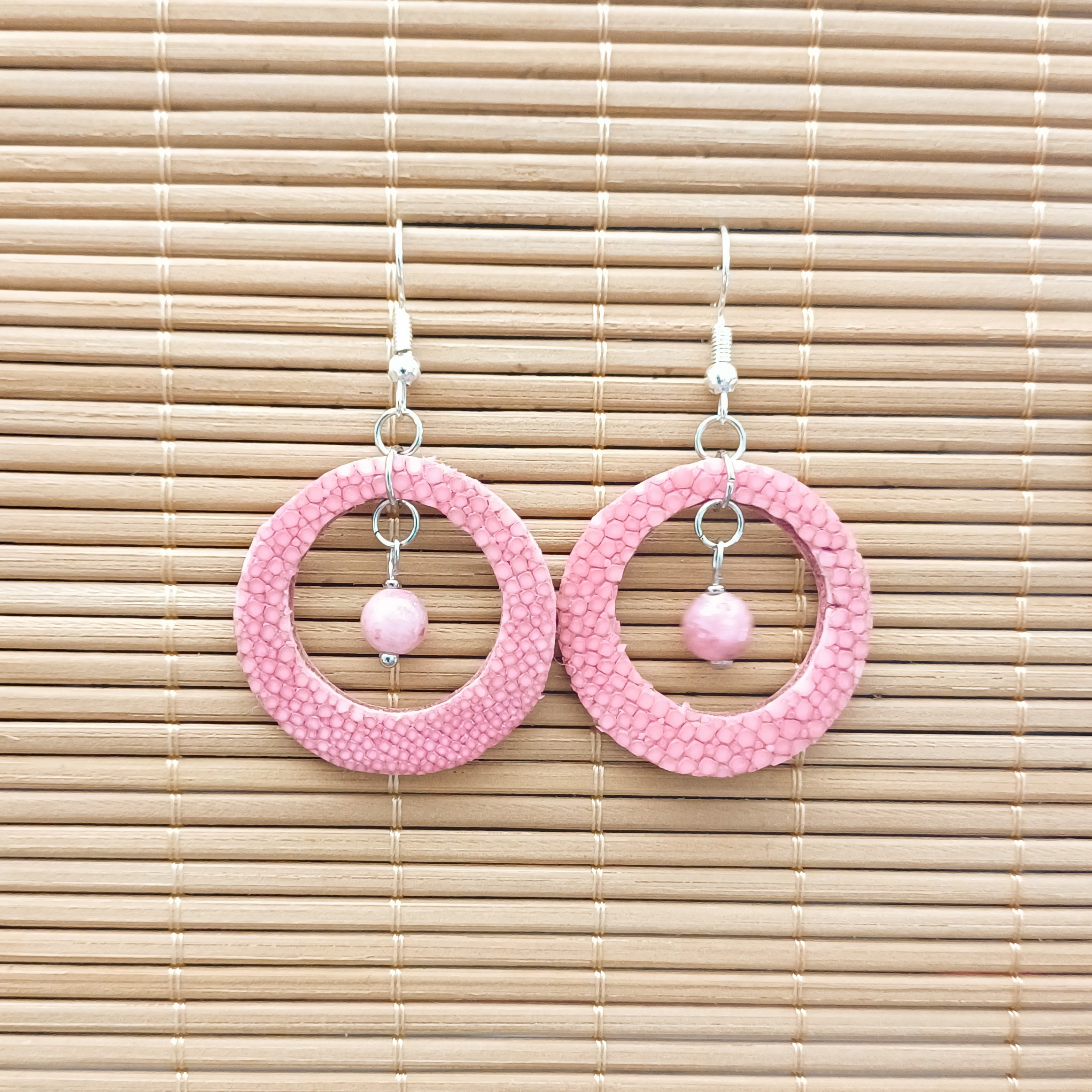 Boucles d ‘oreilles en cuir de veau et galuchat, perles en pierre naturelle et perles de rocailles.