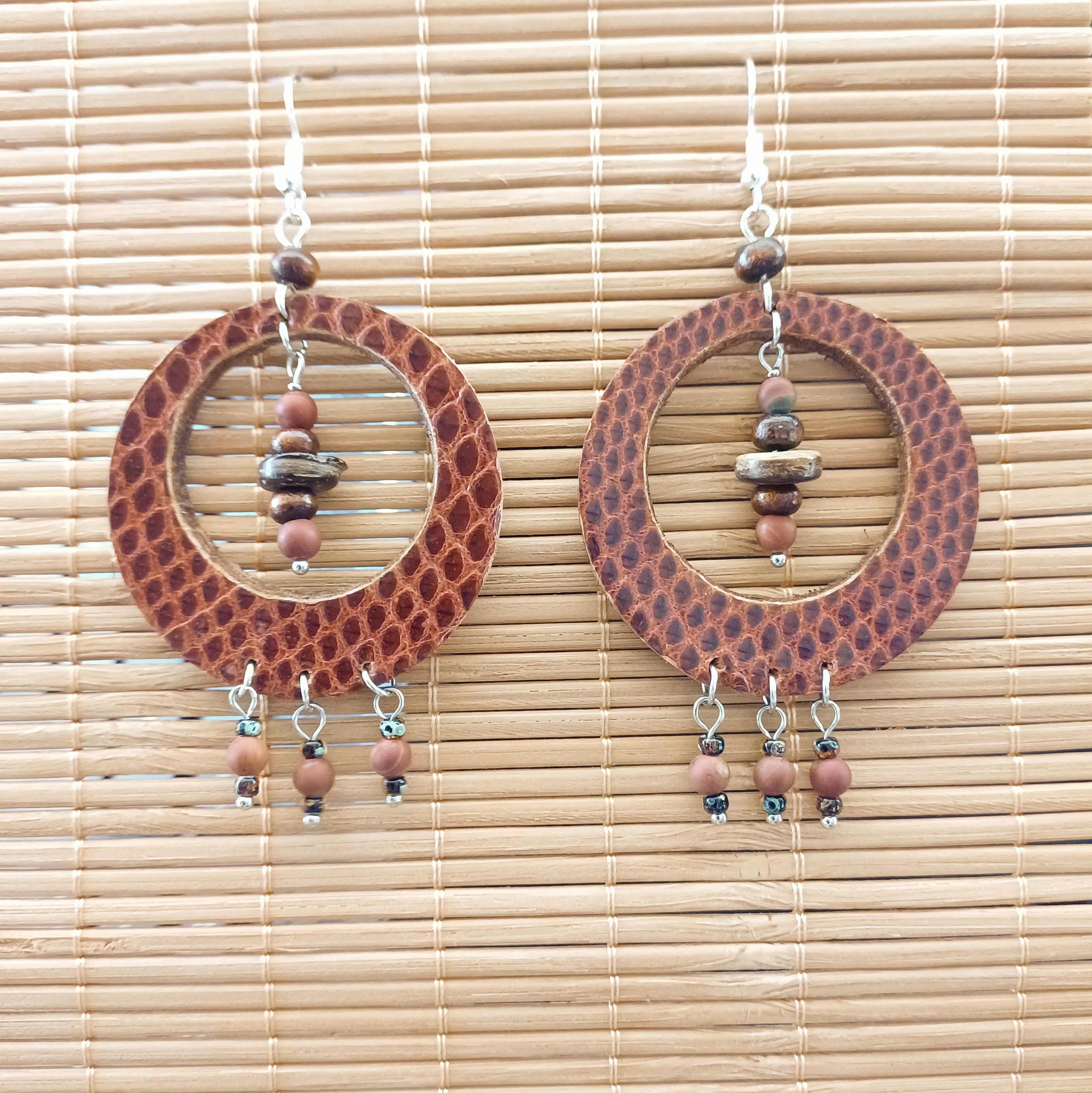Boucles d ‘oreilles en cuir de vachette et peau de lézard, perles en bois, perles en pierre naturelle et perles de rocailles.