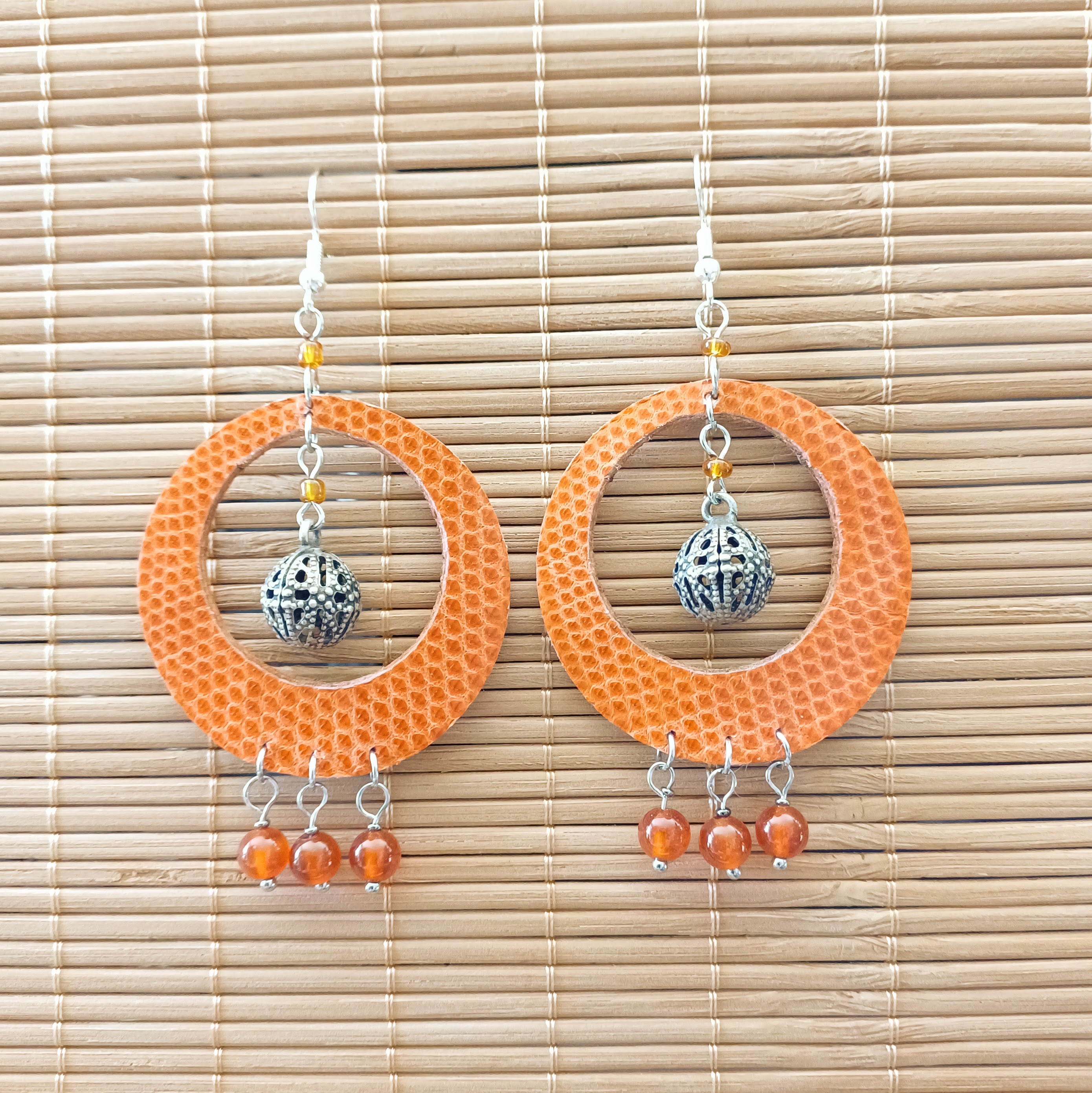 Boucles d ‘oreilles en cuir de veau et peau de lézard, perles en métal, perles en pierre naturelle et perles de rocailles.