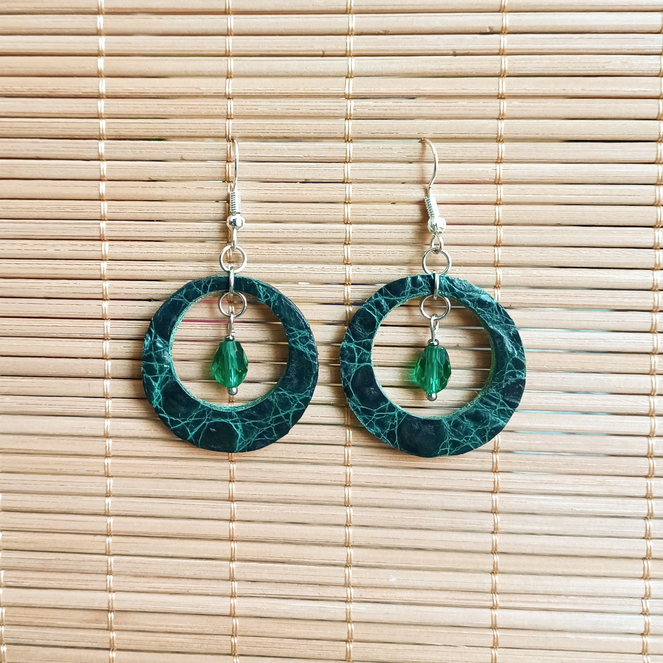 Boucles d ‘oreilles en cuir de veau, perles en verre et perles de rocailles.