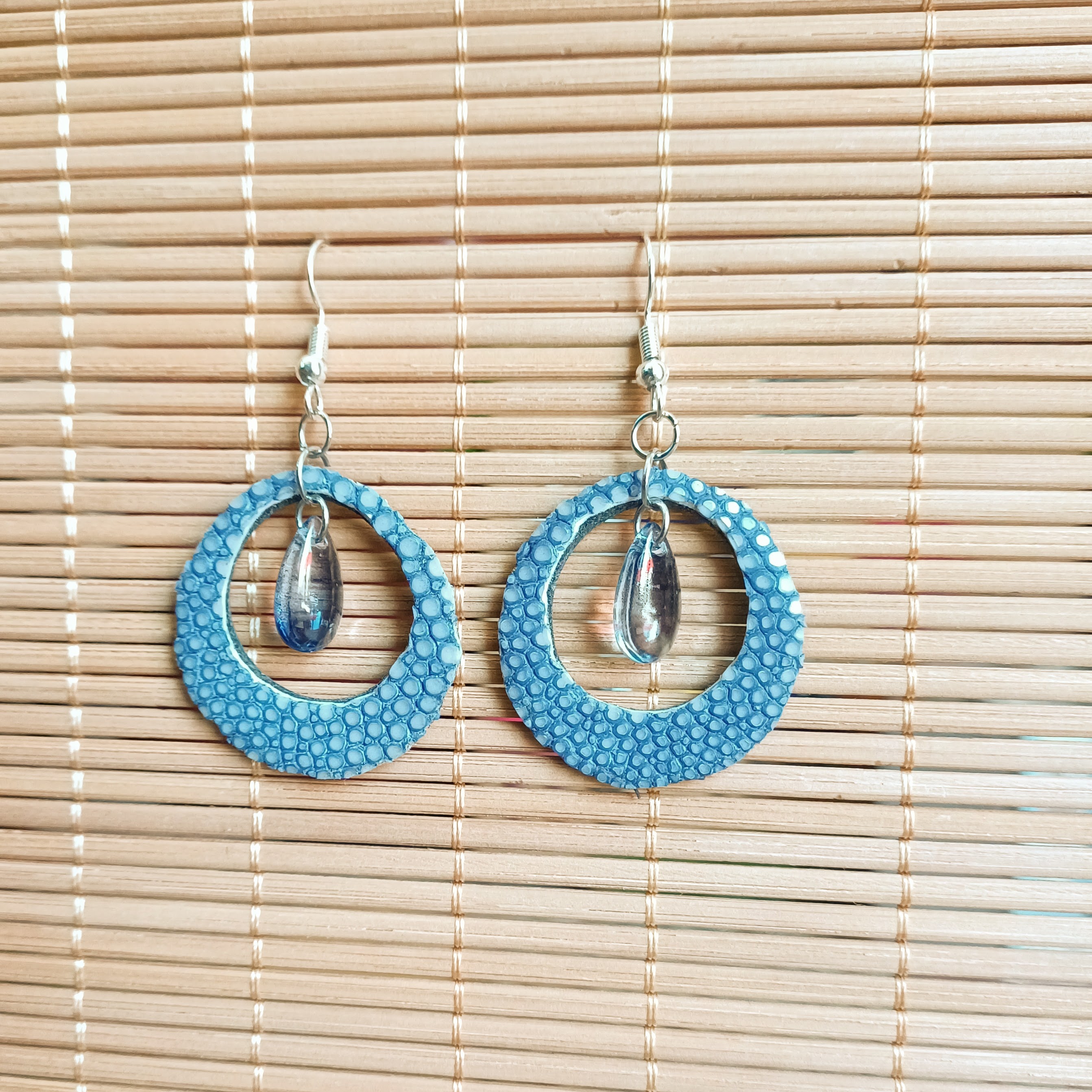 Boucles d ‘oreilles en cuir d’agneau et galuchat et perles en verre.