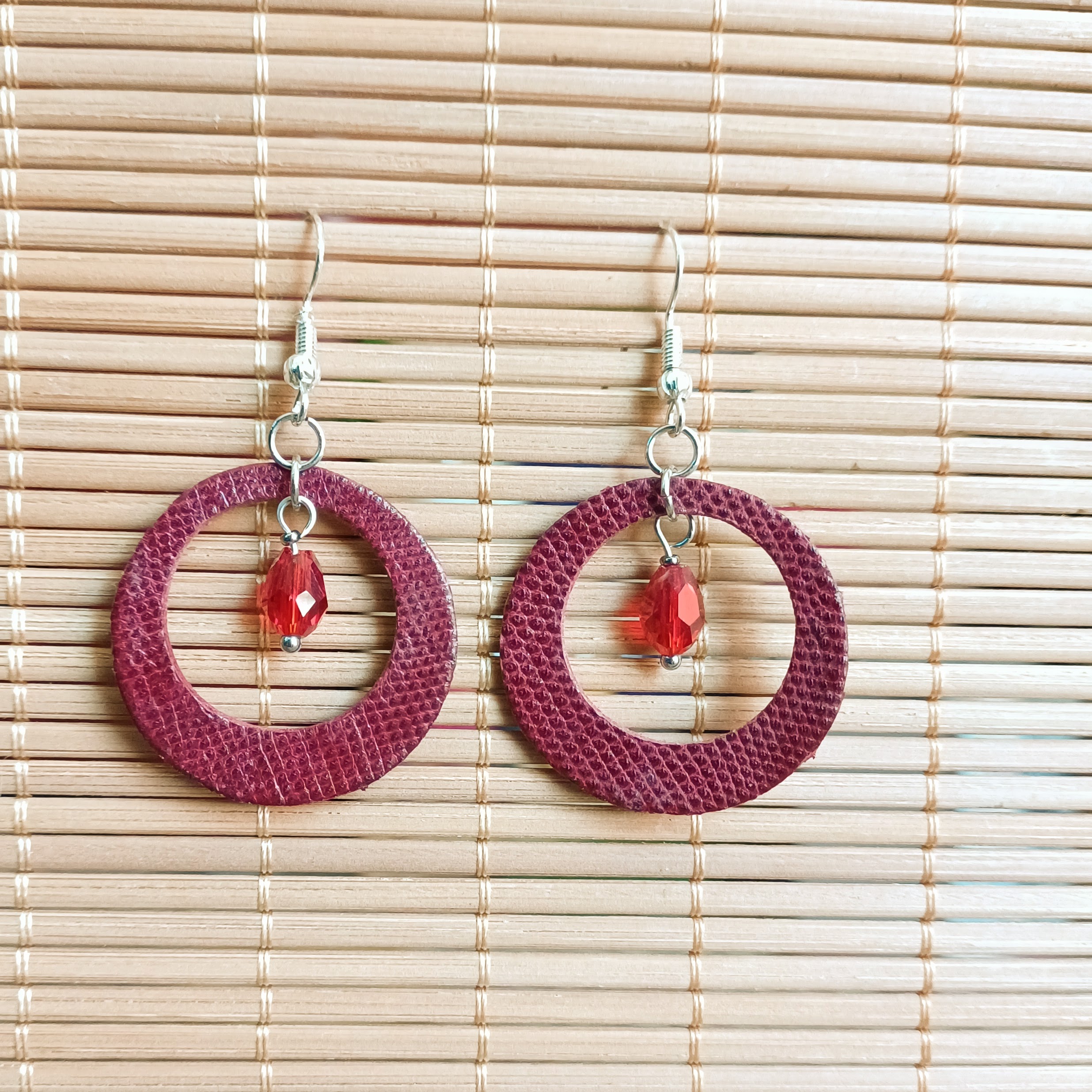 Boucles d ‘oreilles en cuir de veau et peau de lézard, perles de rocailles et perles en verre.