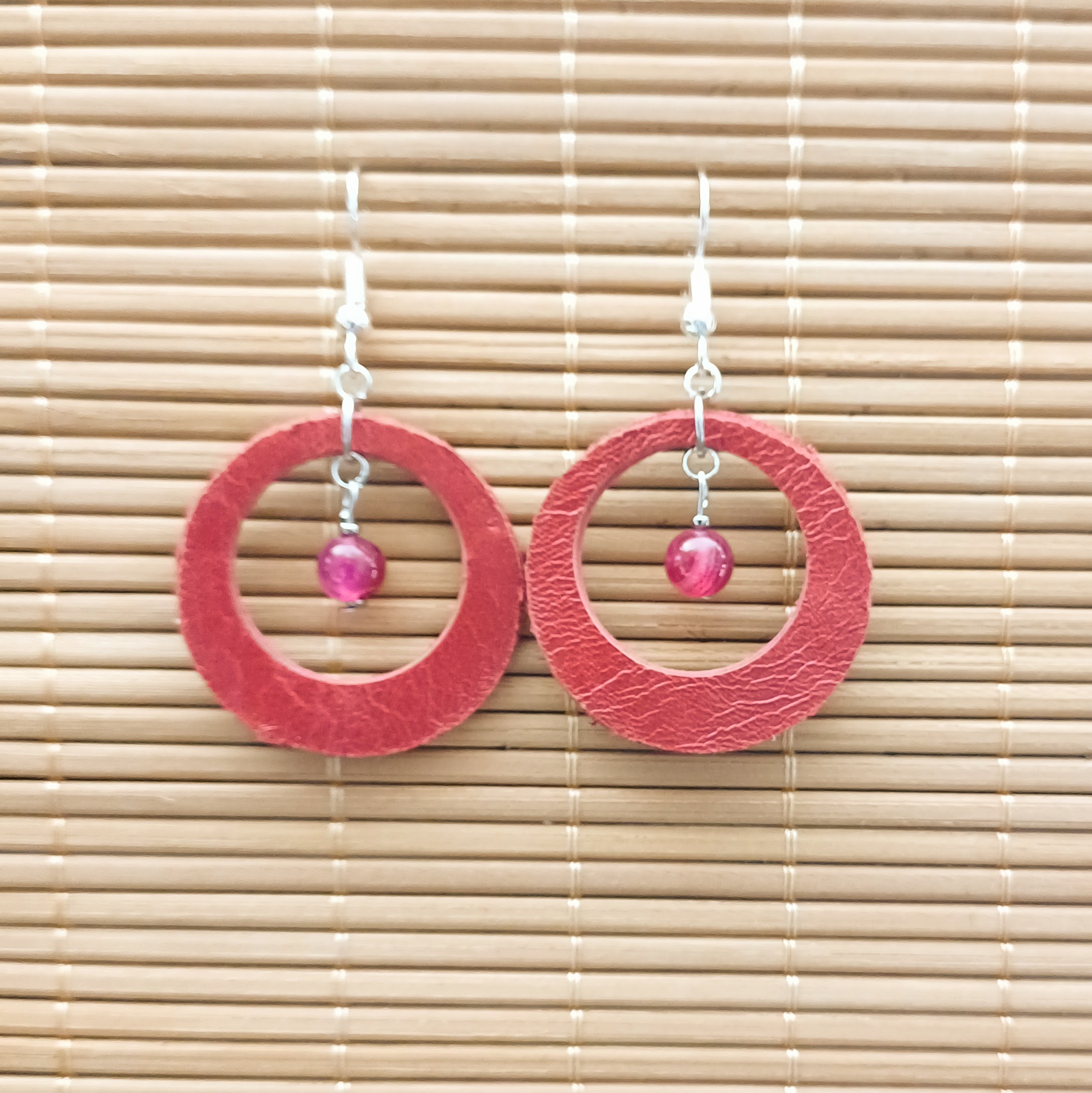 Boucles d ‘oreilles en cuir de veau et cuir d’agneau, perles en pierre naturelle et perles de rocailles.