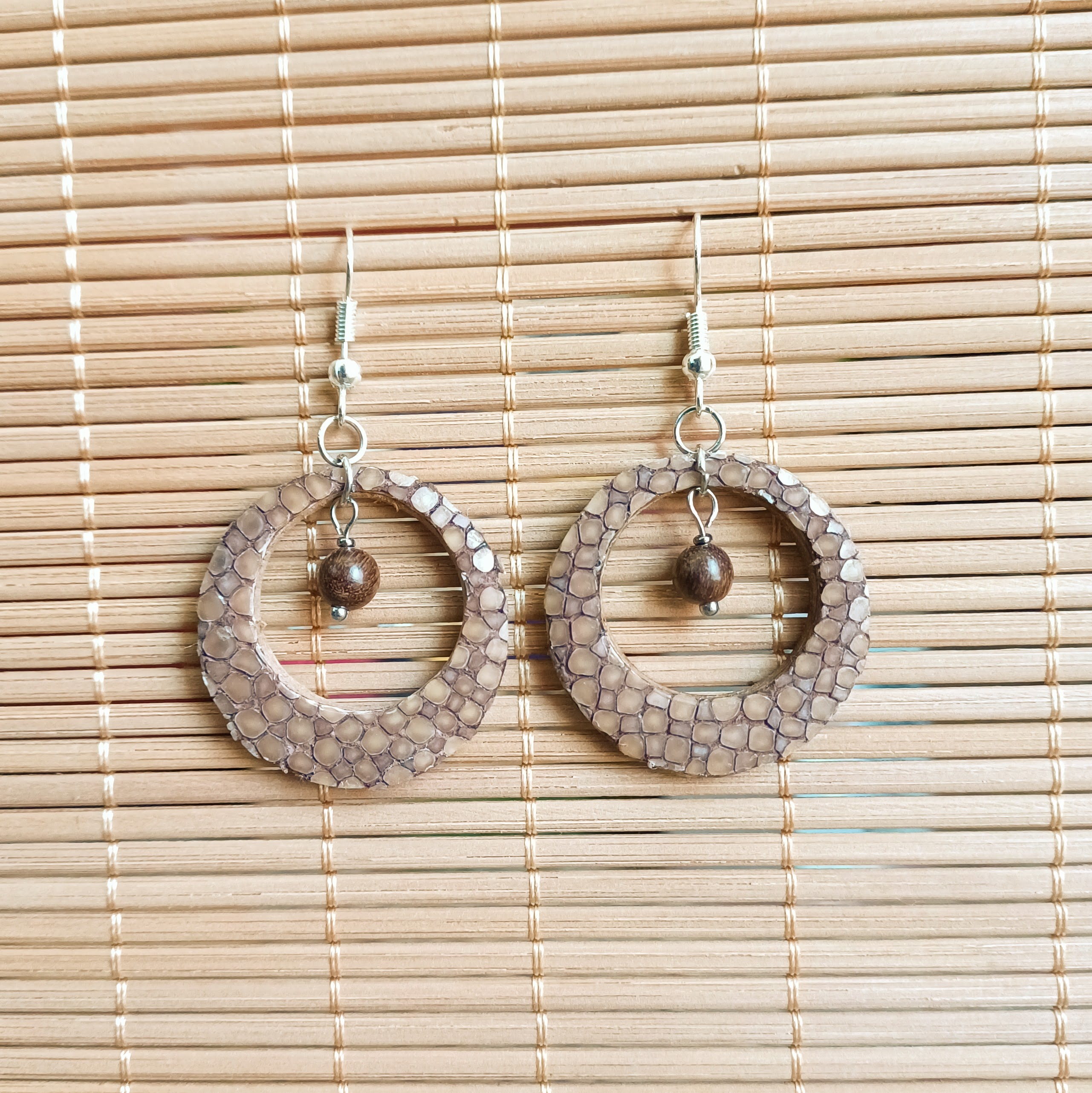 Boucles d ‘oreilles en cuir de vachette et galuchat, perles en bois