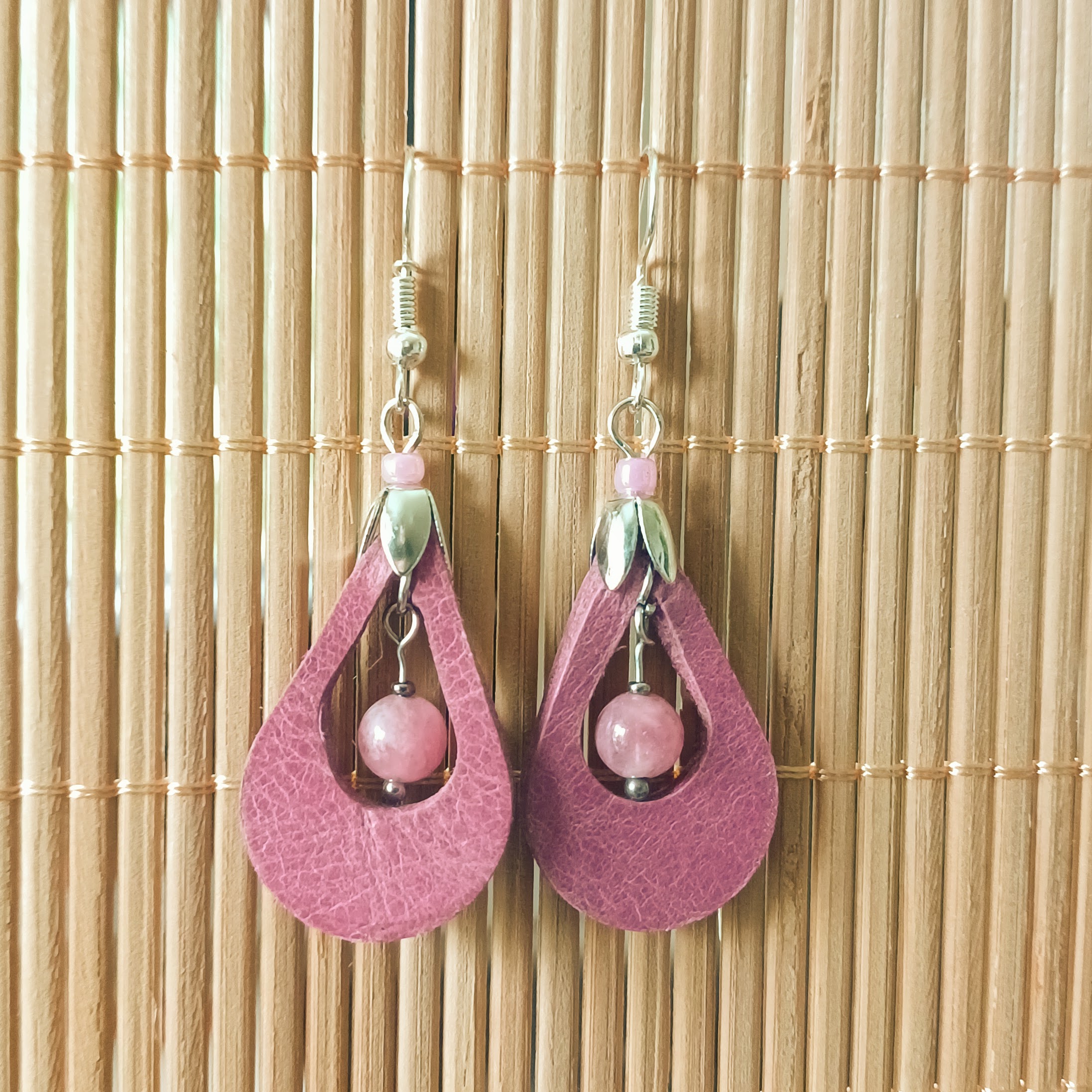 Boucles d ‘oreilles en cuir de veau, perles naturelles et perles de rocailles