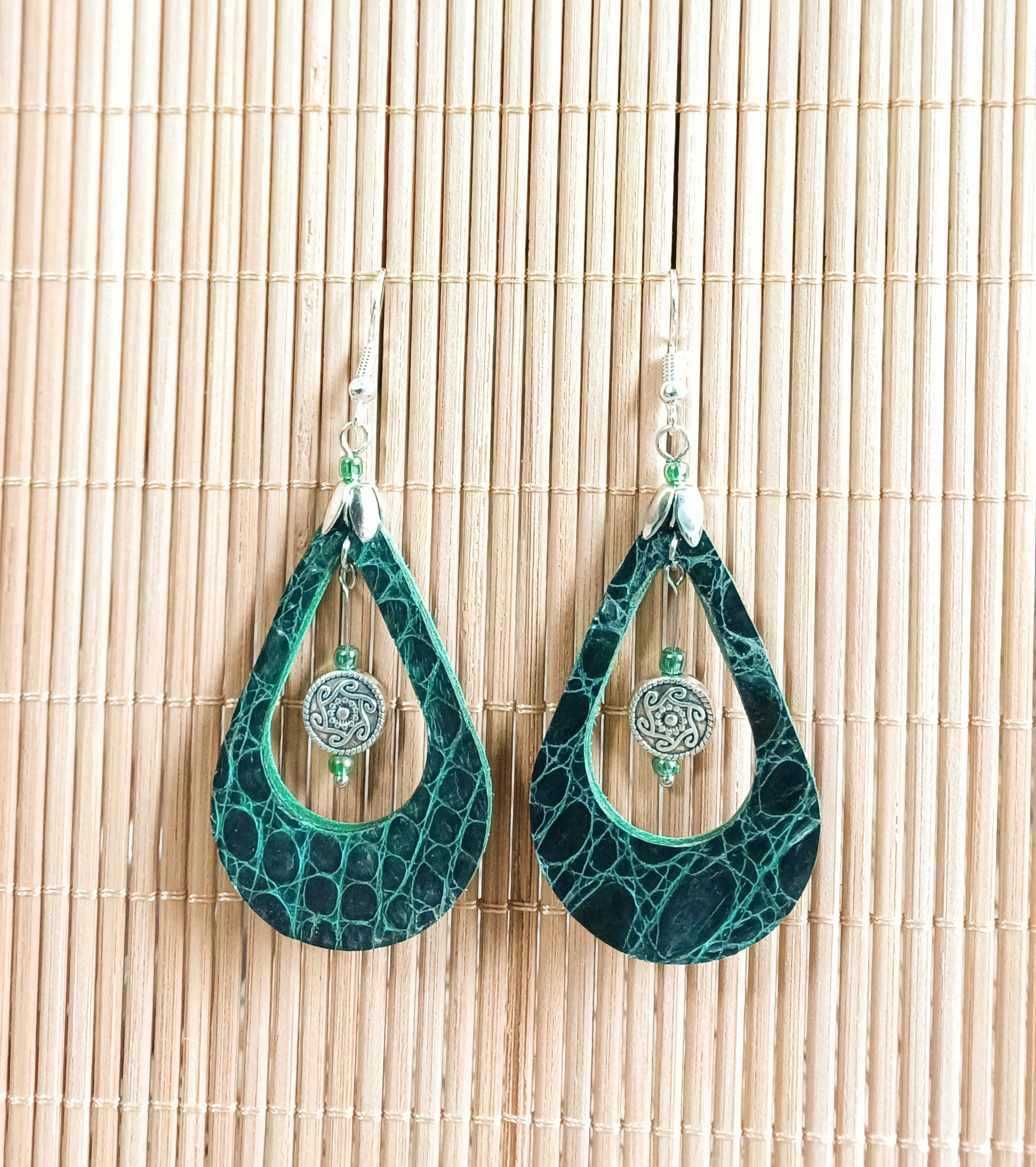 Boucles d ‘oreilles en cuir de crocodile et cuir de veau, perles en métal et perles de rocailles