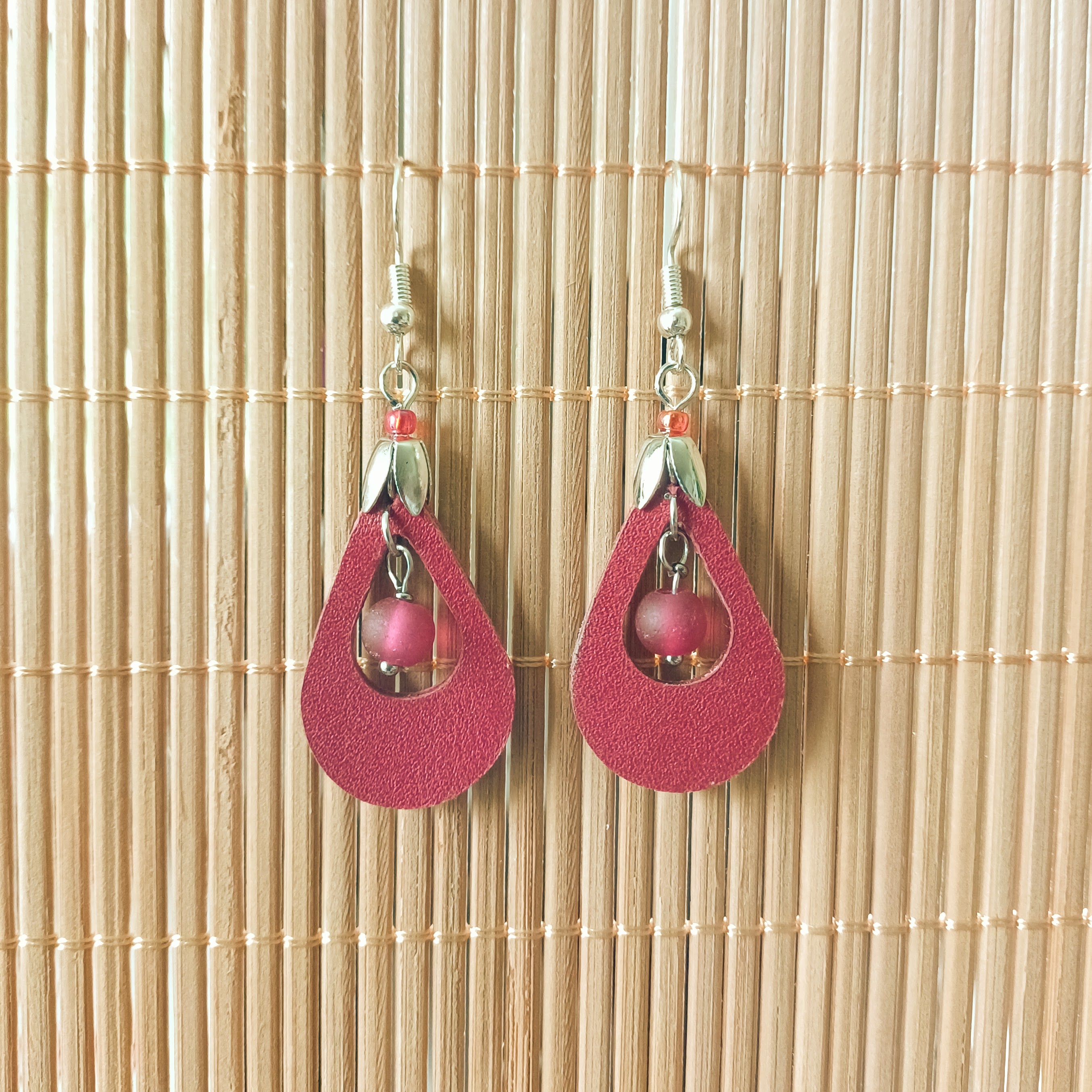 Boucles d ‘oreilles en cuir de veau, perles en verre et perles de rocailles