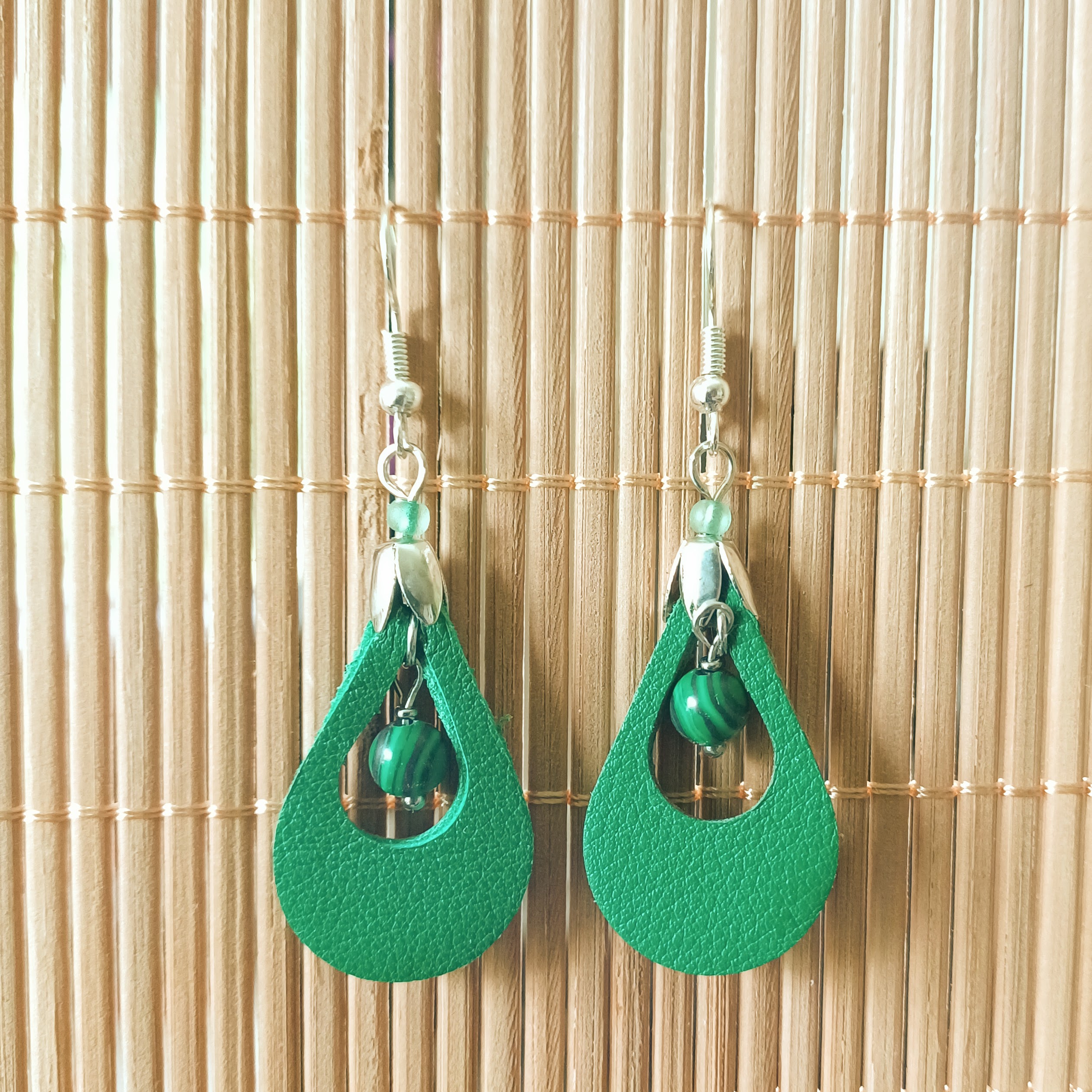 Boucles d ‘oreilles en cuir de veau, perles en pierre naturelle et perles de rocailles