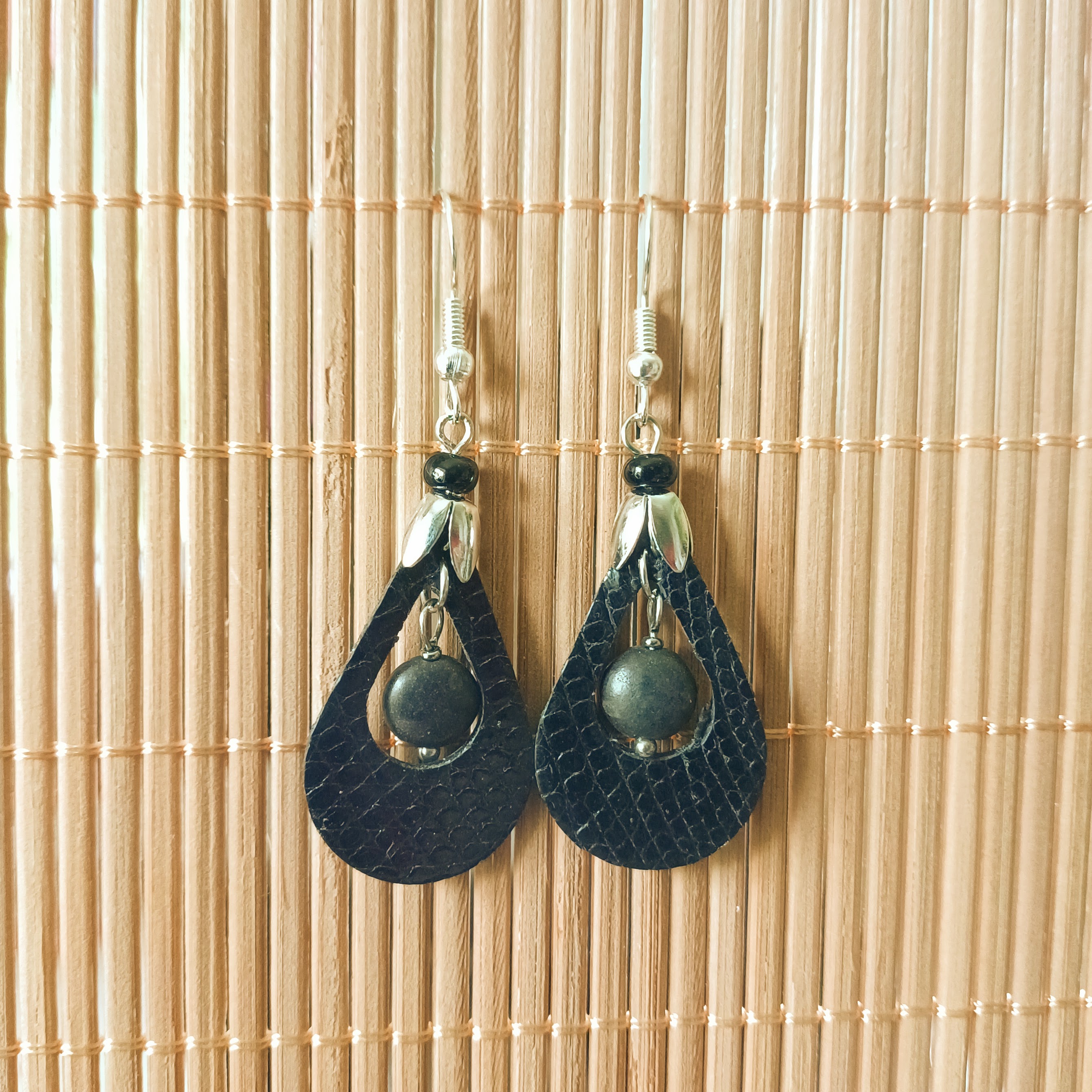 Boucles d ‘oreilles en cuir de veau et peau de lézard, perles fantaisie et perles de rocailles
