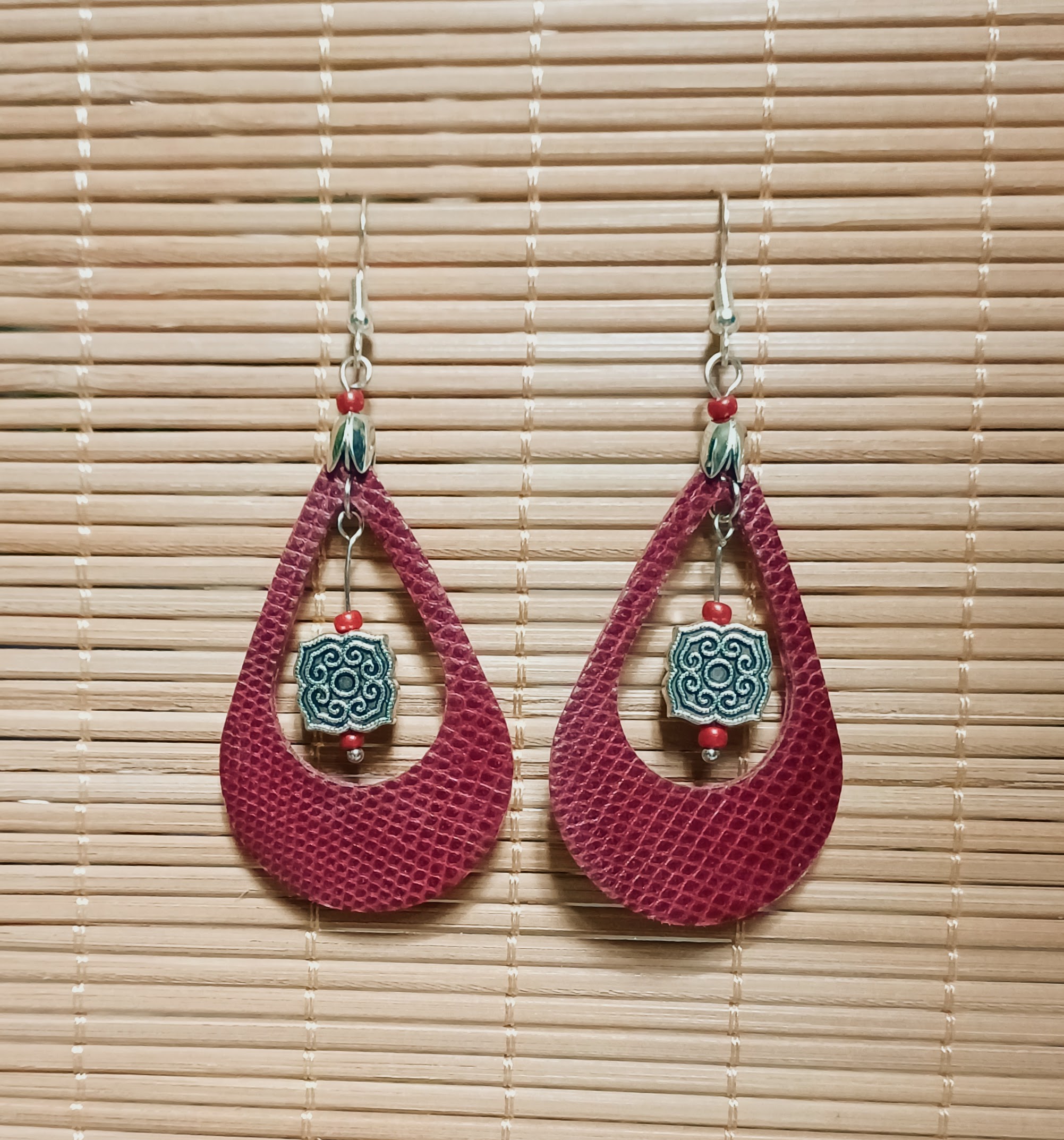 Boucles d ‘oreilles en cuir de lézard et cuir de veau, perles en métal et perles de rocailles