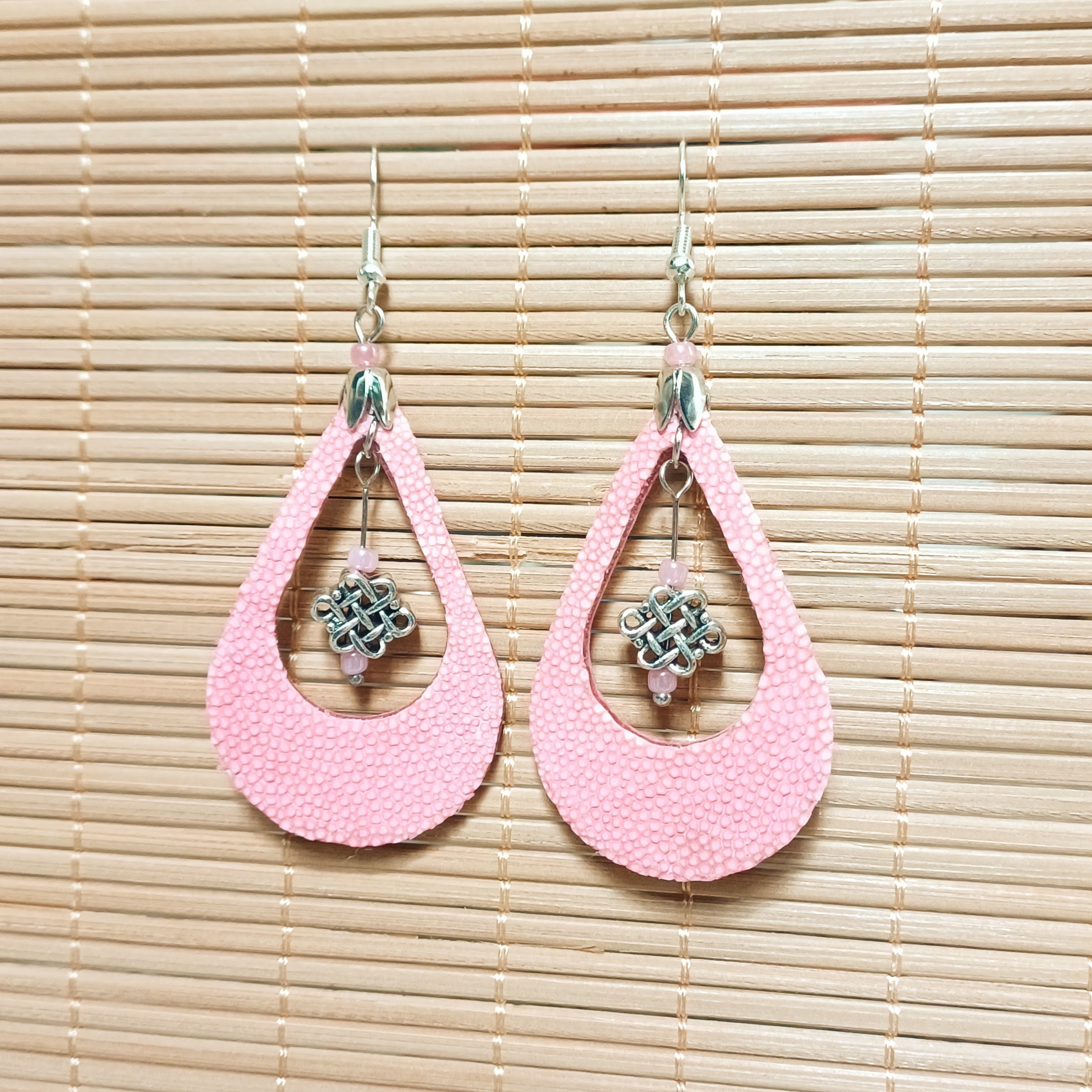 Boucles d ‘oreilles en galuchat et cuir de veau, perles en métal et perles de rocailles