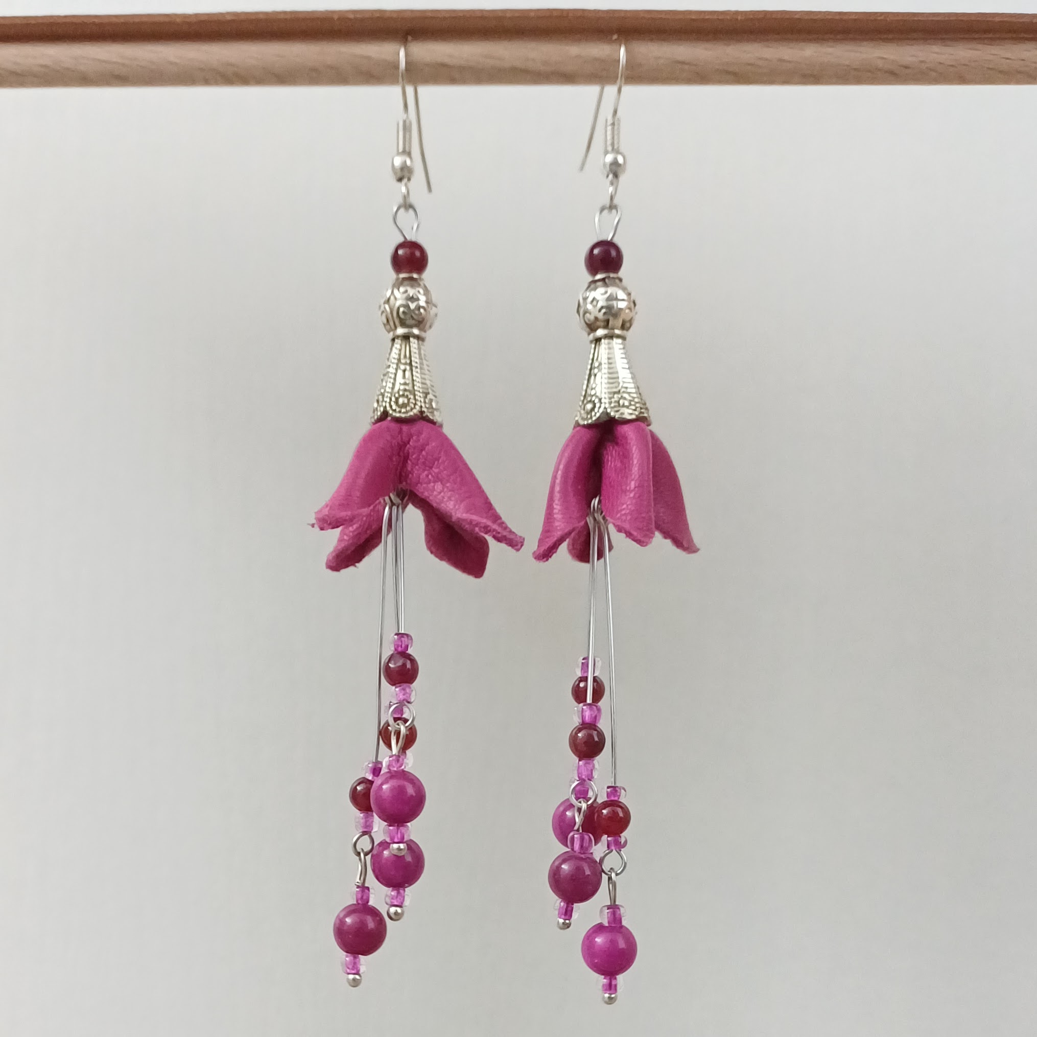 Boucles d’oreilles en cuir d’agneau, perles en pierre naturelle et perles de rocailles; apprêts en métal sans chrome ni nickel.