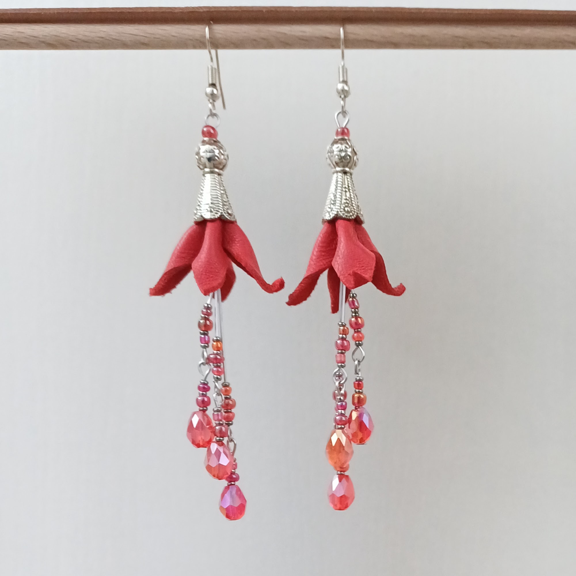 Boucles d’oreilles en cuir d’agneau, perles en verre et perles de rocailles; apprêts en métal sans chrome ni nickel.