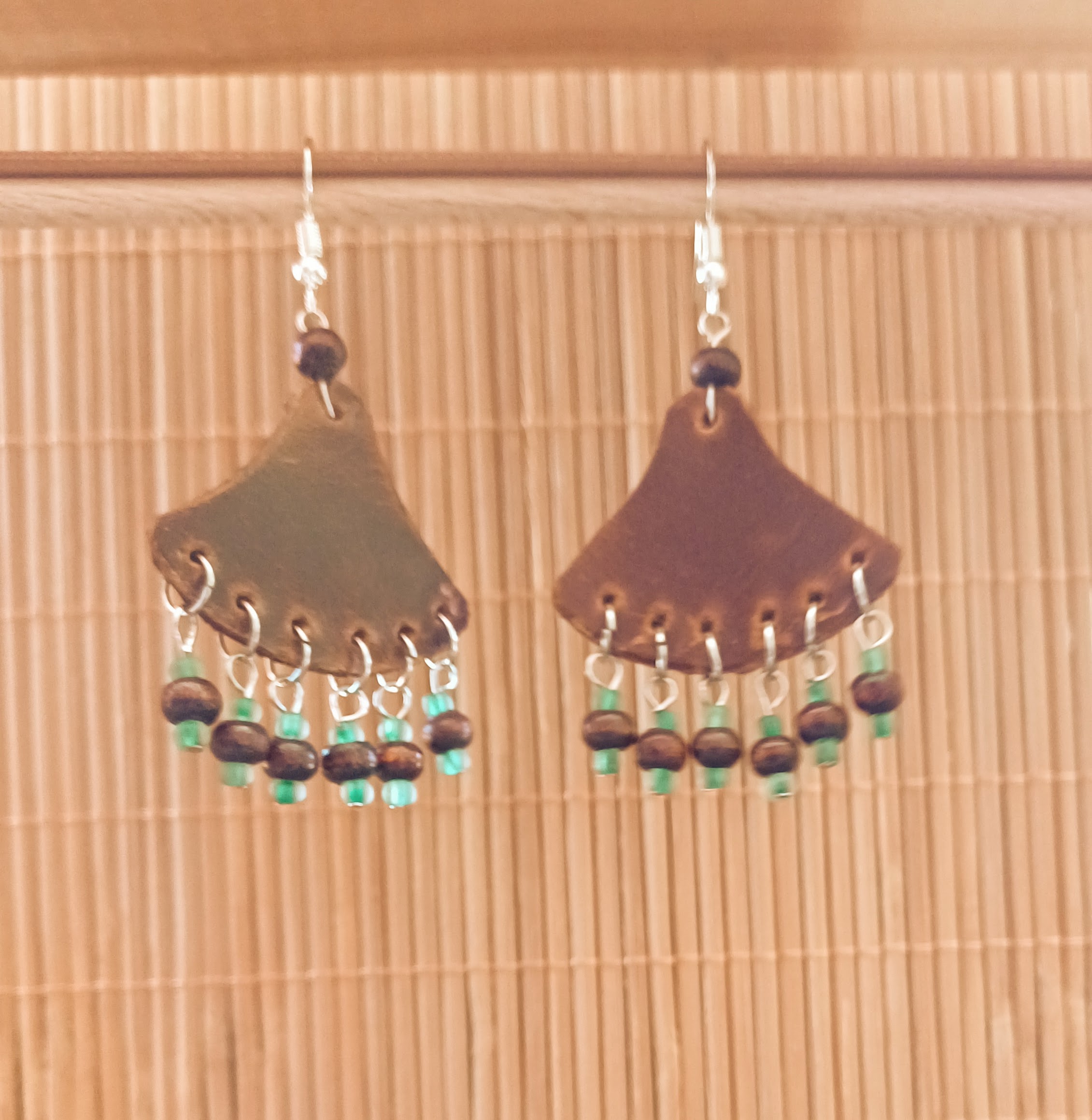 Boucles d’oreilles en cuir de vachette et perles de rocailles.