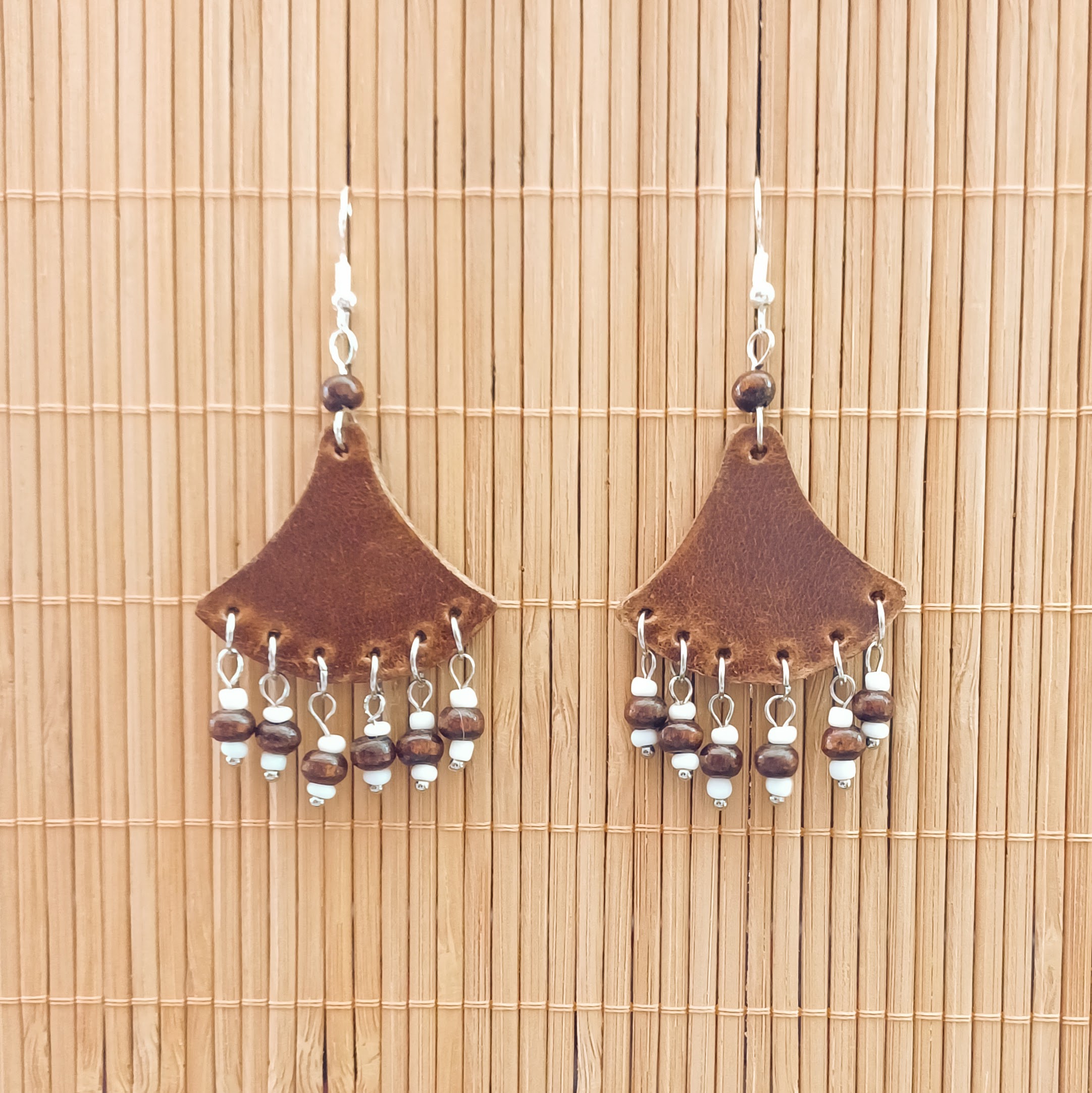 Boucles d’oreilles en cuir de vachette et perles de rocailles.