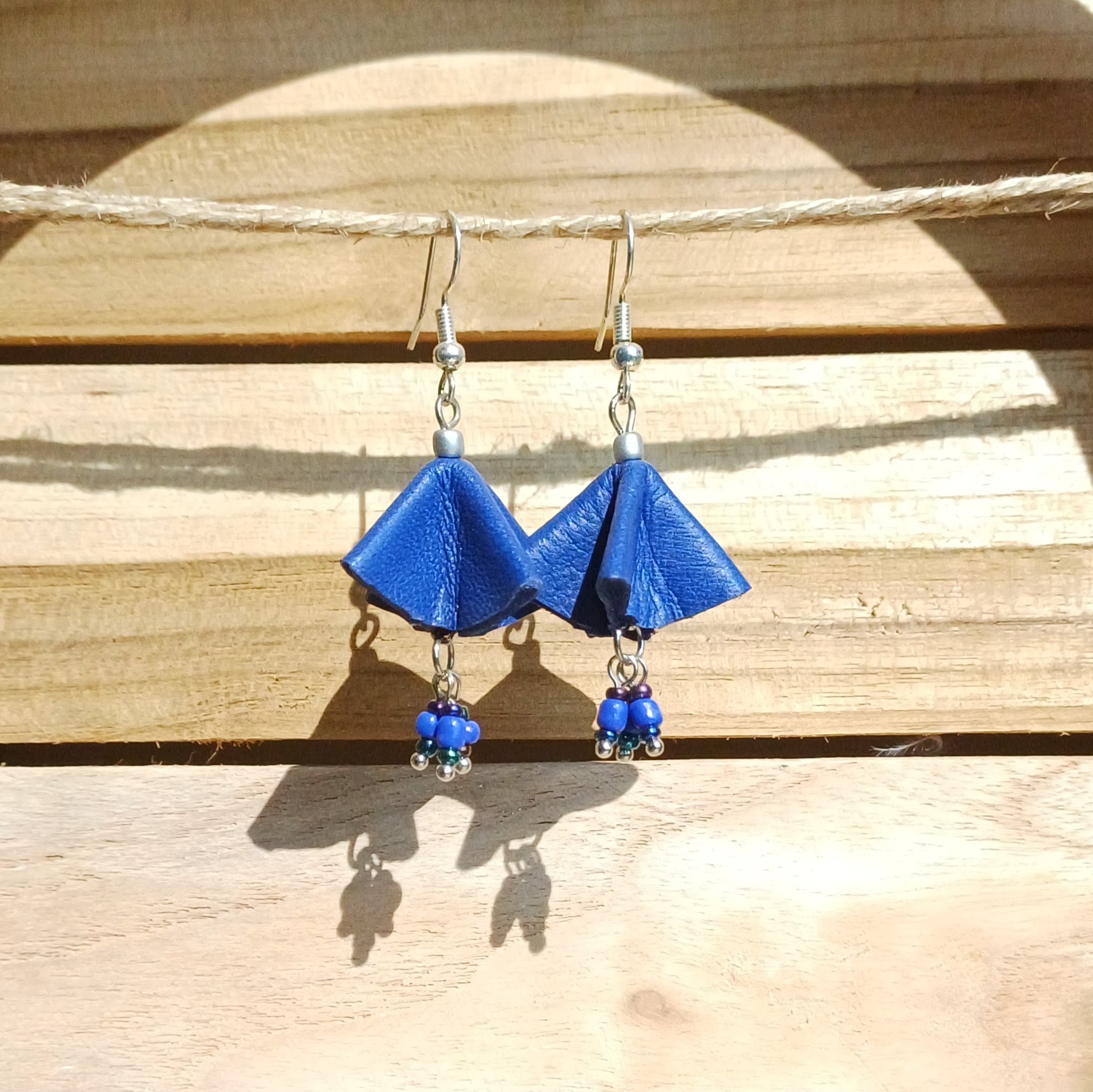 Boucles d’oreilles en cuir d’agneau, perles en verre et perles de rocailles; apprêts en métal sans chrome ni nickel.