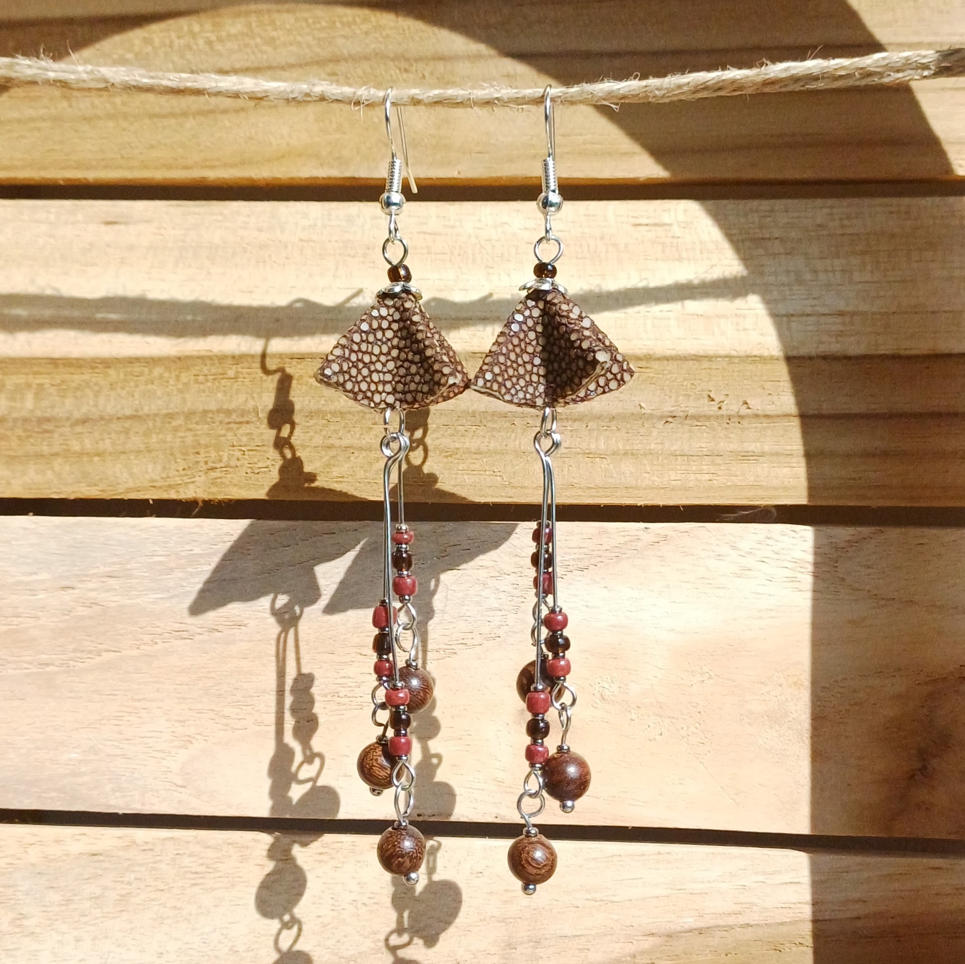Boucles d’oreilles en galuchat , perles en bois de santal et perles de rocailles; apprêts en métal sans chrome ni nickel.
