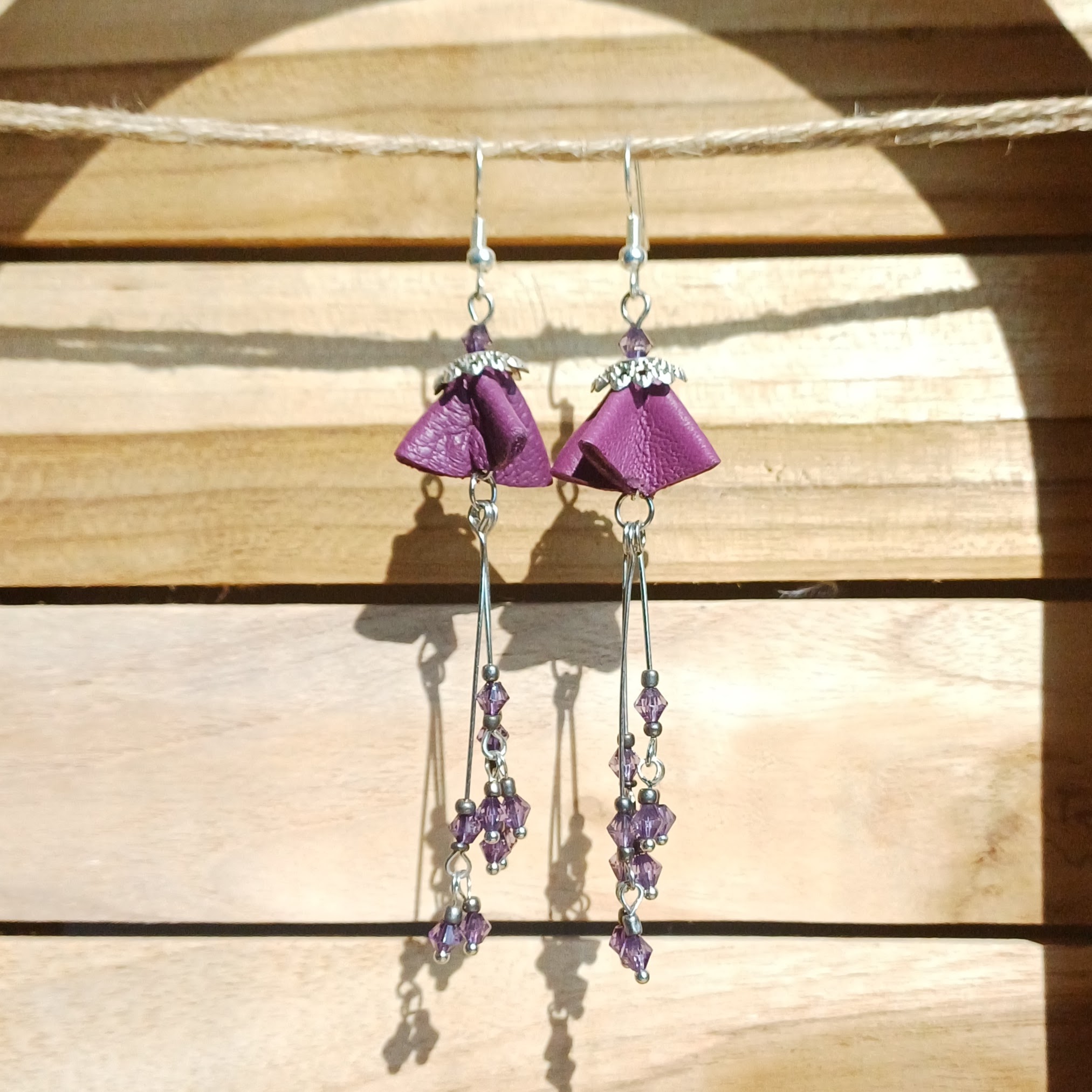Boucles d’oreilles en cuir d’agneau, perles multifacettes en verre et perles de rocailles; apprêts en métal sans chrome ni nickel.