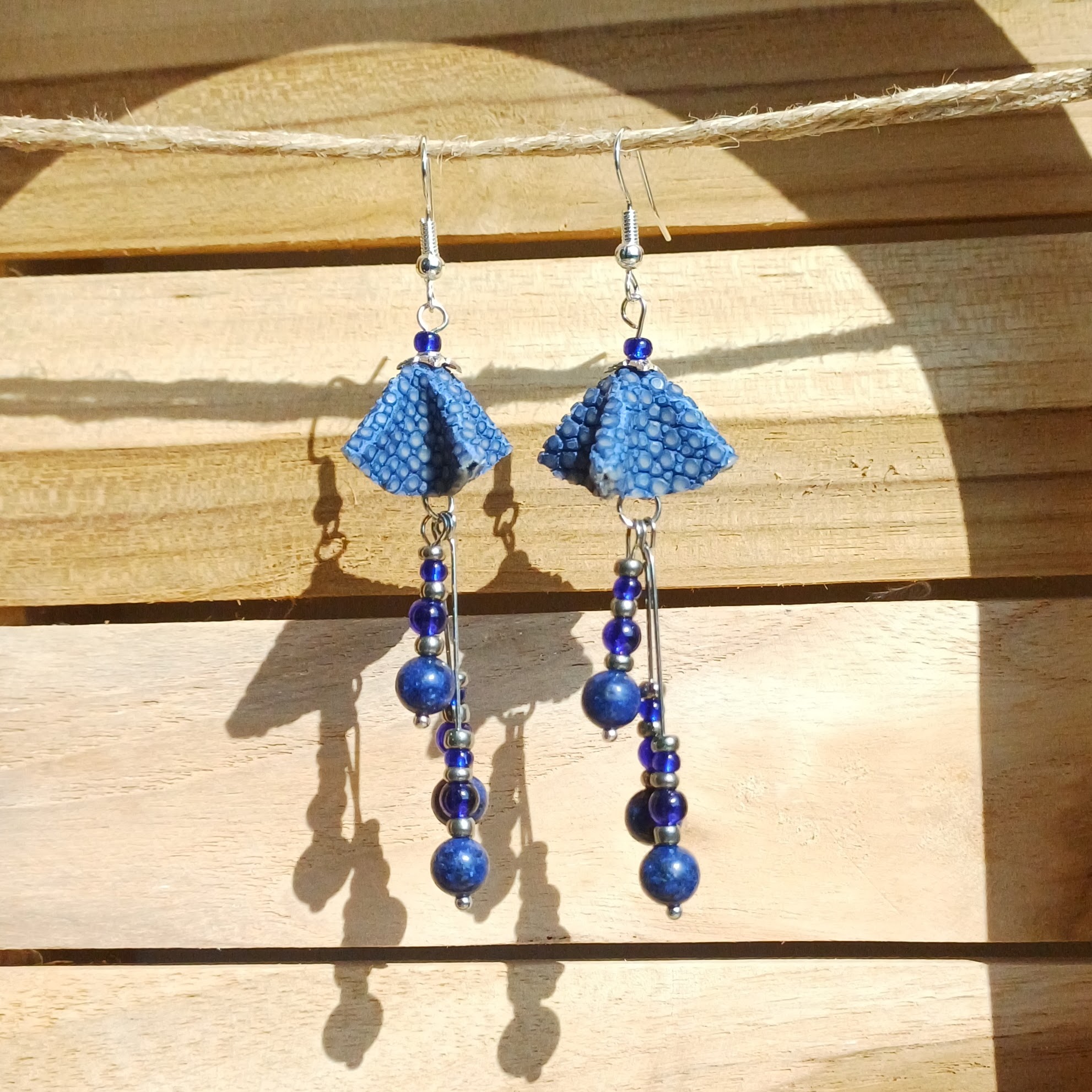 Boucles d’oreilles en galuchat, perles en pierre naturelle, perles en verre et perles de rocailles; apprêts en métal sans chrome ni nickel.
