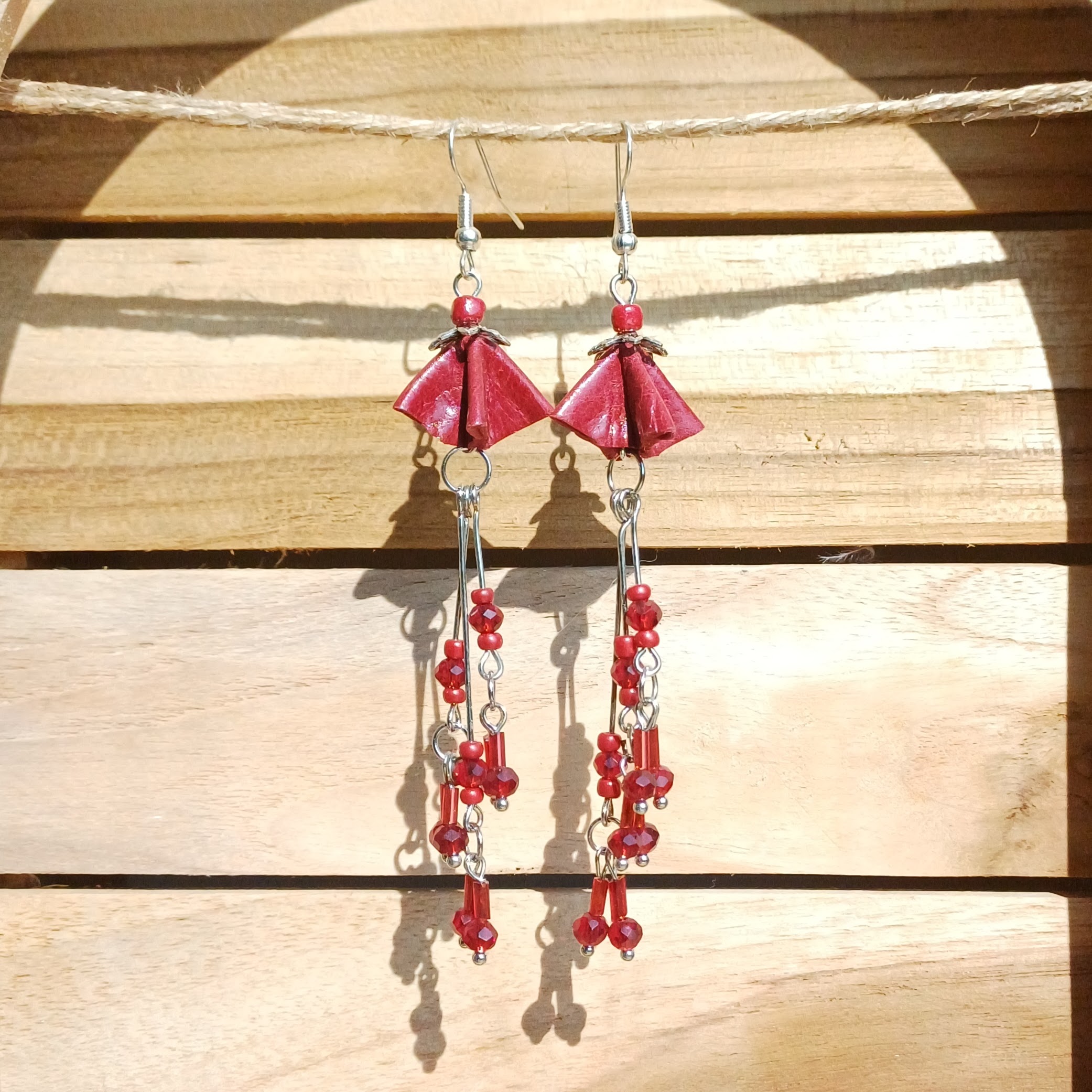Boucles d’oreilles en cuir d’agneau, perles multifacettes en verre, perles tube en verre et perles de rocailles; apprêts en métal sans chrome ni nickel.