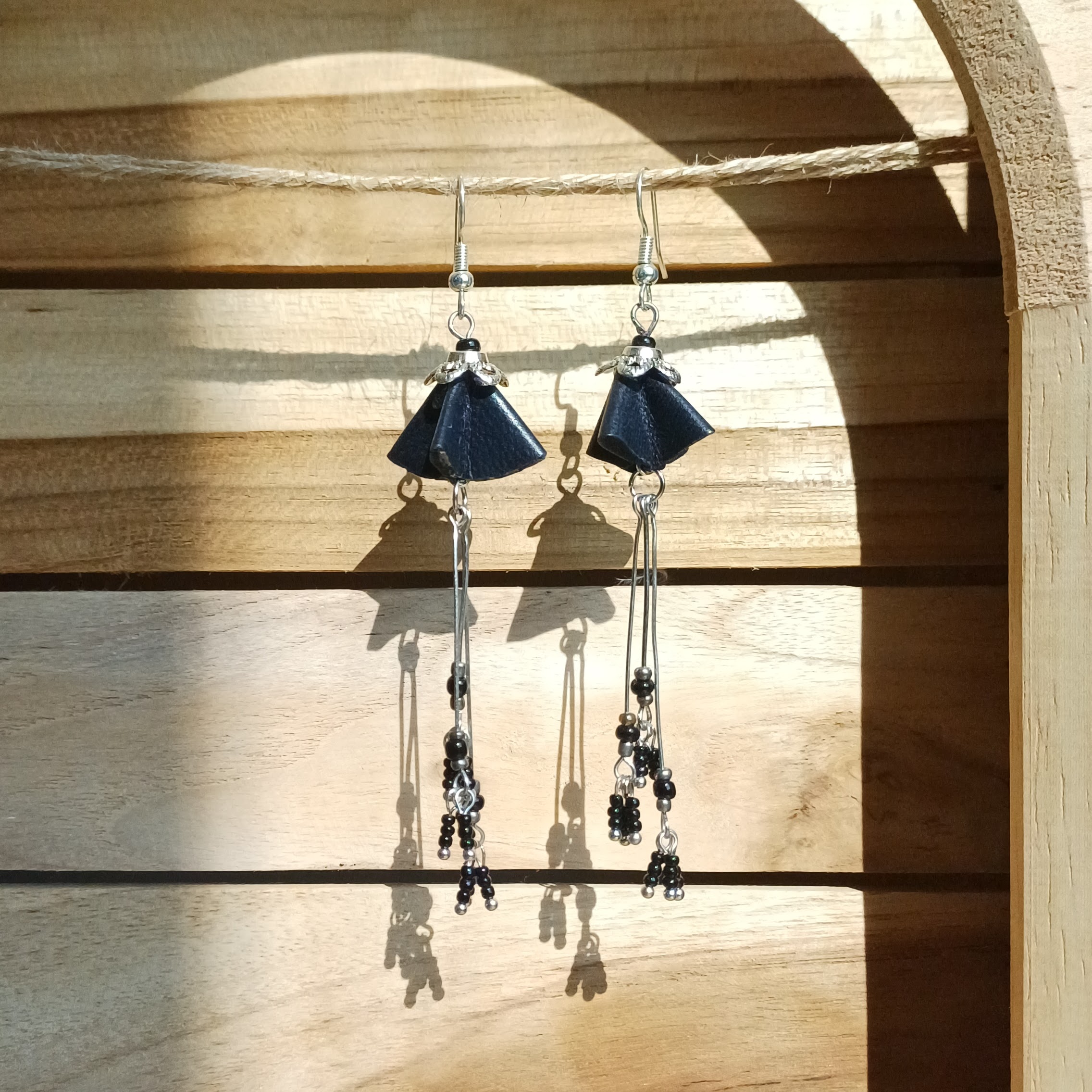 Boucles d’oreilles en cuir d’agneau et perles de rocailles; apprêts en métal sans chrome ni nickel.