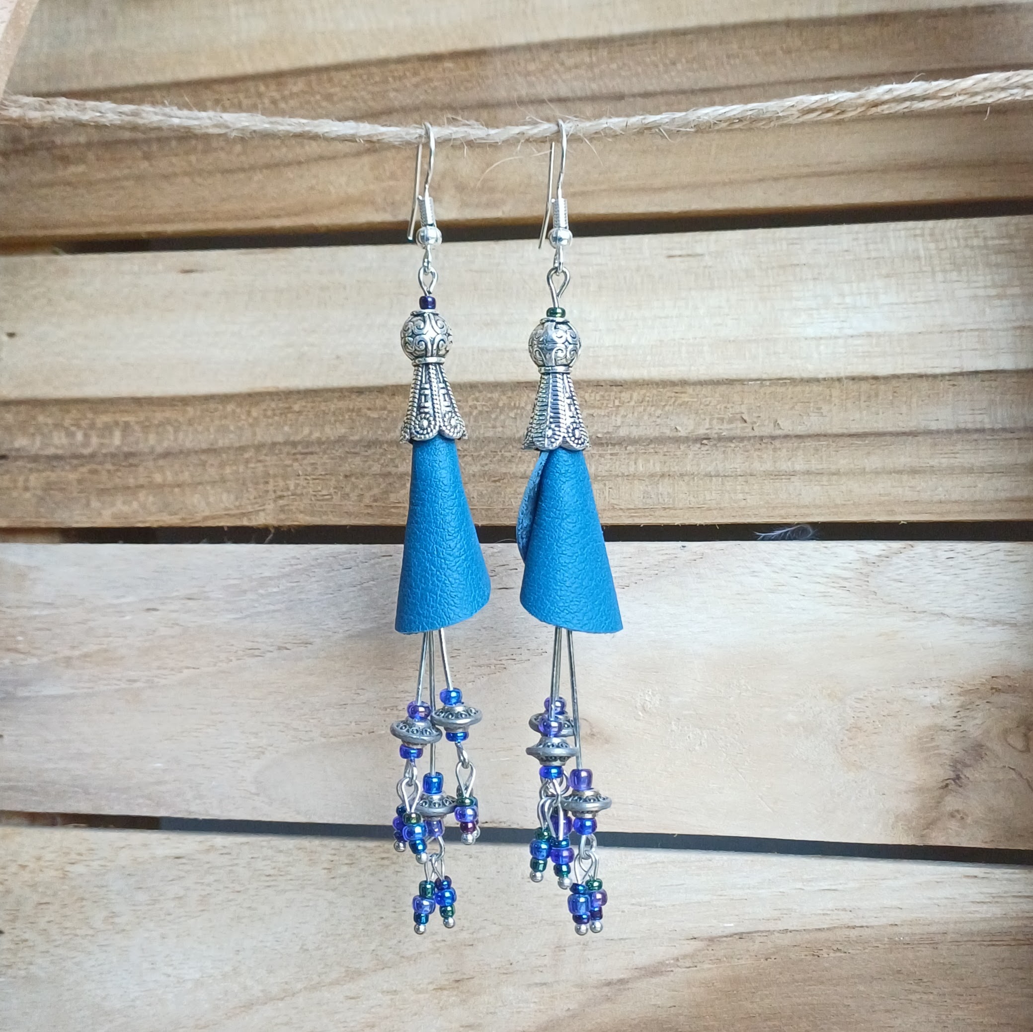 Boucles d’oreilles en cuir de veau, perles de rocailles; apprêts en métal sans chrome ni nickel.