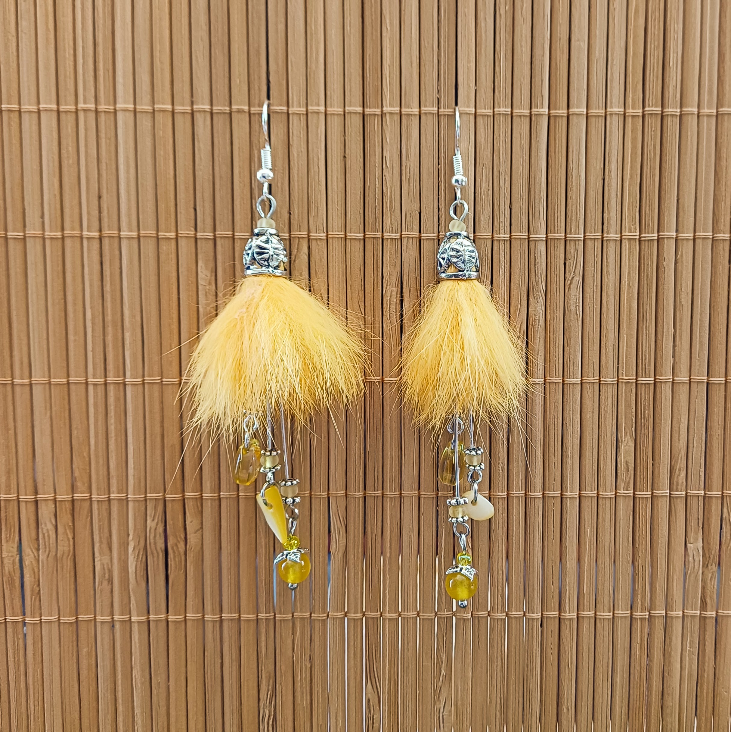 Boucles d’oreilles en fourrure de lapin, perles en nacre et perles de rocailles; apprêts en métal sans chrome ni nickel.