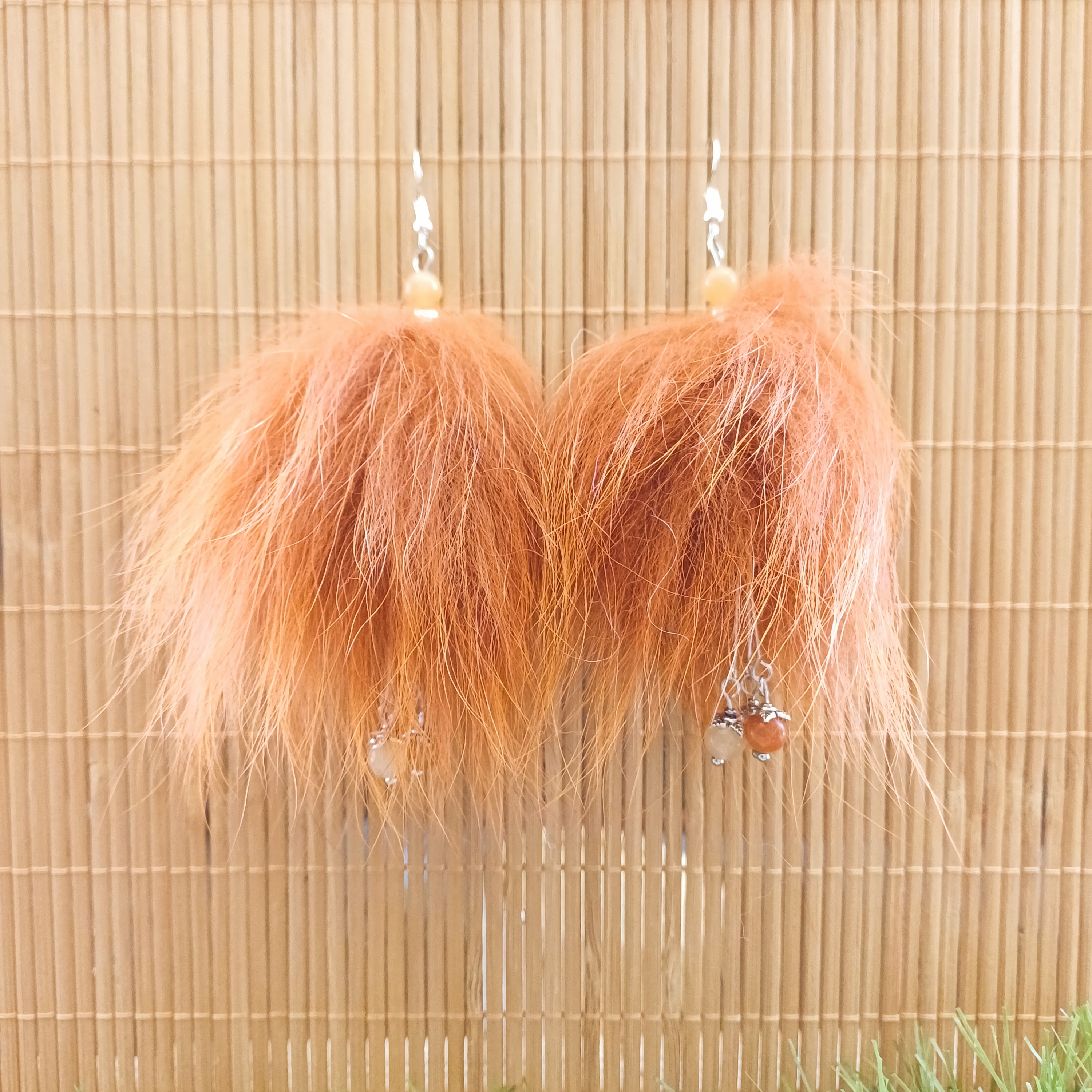 Boucles d’oreilles en fourrure de renard, perles en pierre naturelle et perles de rocailles; apprêts en métal sans chrome ni nickel.
