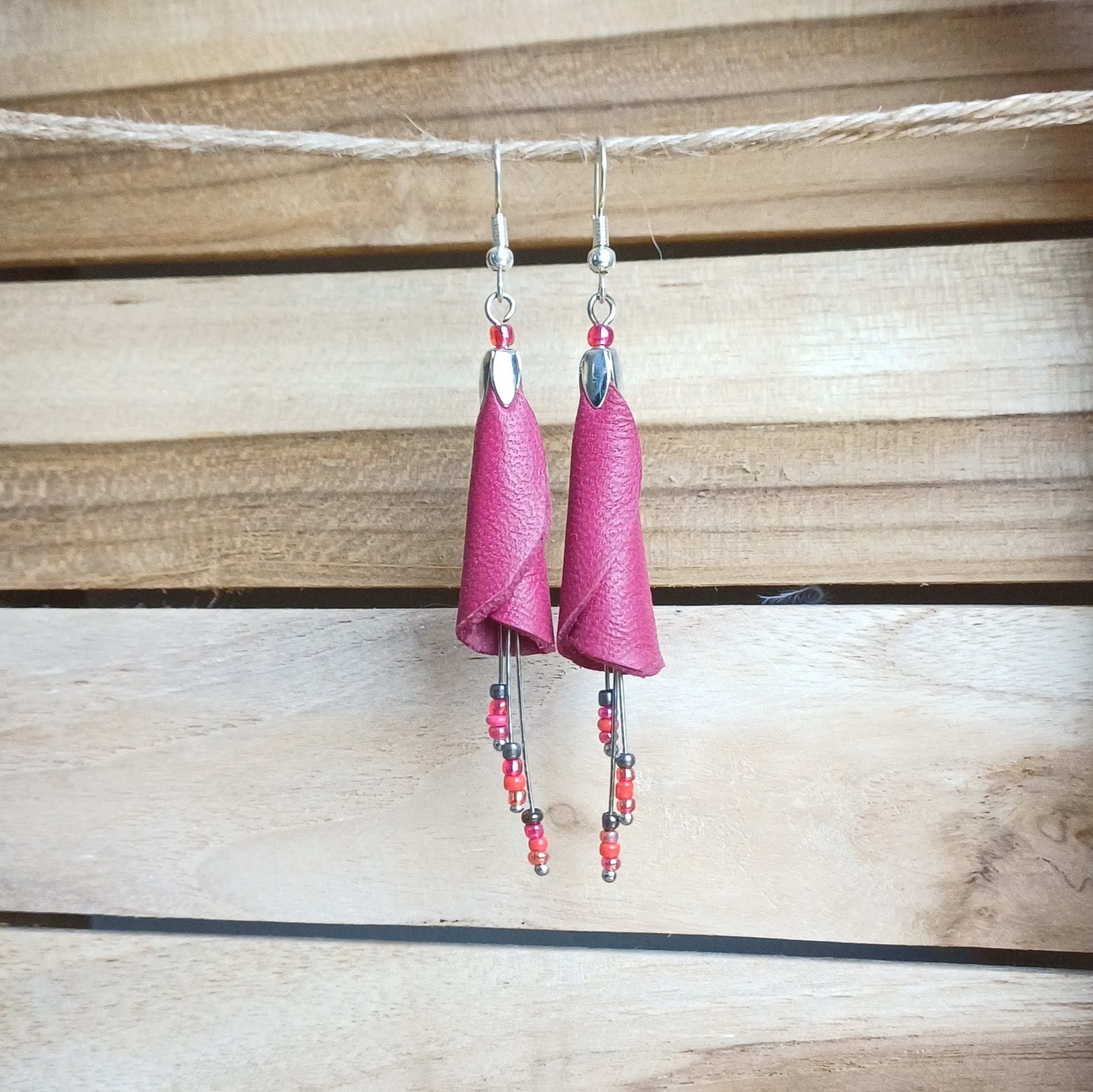 Boucles d’oreilles en cuir d’agneau et perles de rocailles; apprêts en métal sans chrome ni nickel.