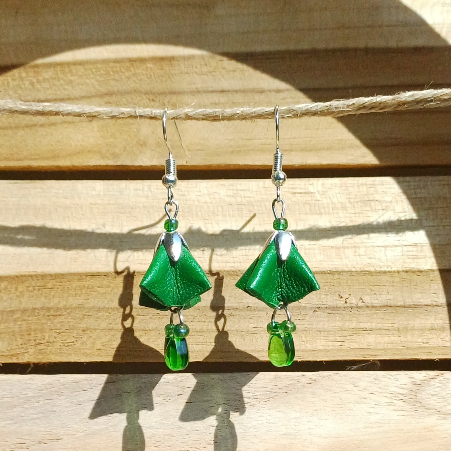 Boucles d’oreilles en cuir de veau, perles goutte en verre et perles de rocailles; apprêts en métal sans chrome ni nickel.