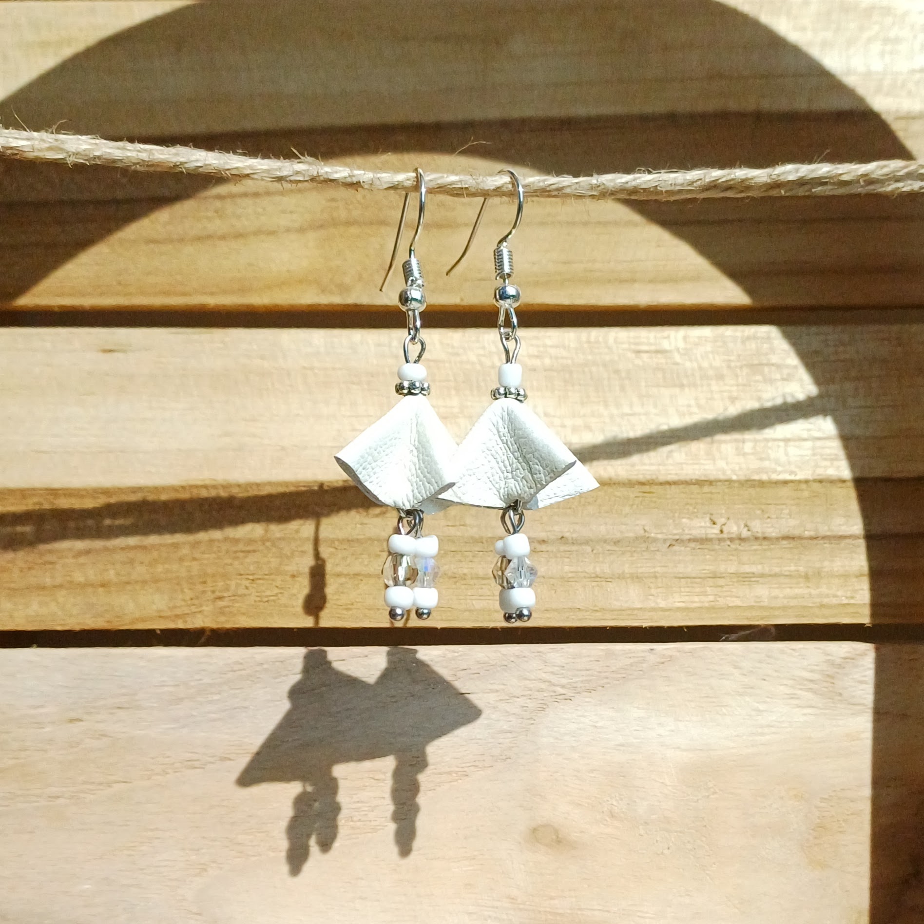 Boucles d’oreilles en cuir d’agneau, perles en verre multifacettes et perles de rocailles; apprêts en métal sans chrome ni nickel.