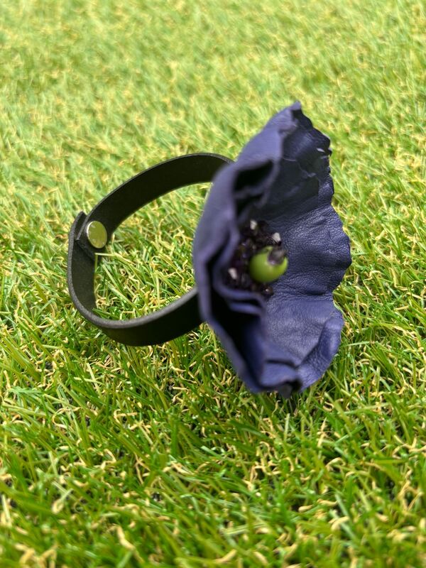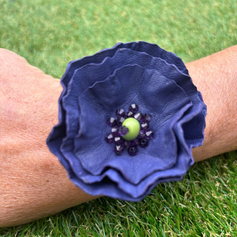 Fleur en cuir d’agneau, perles en résine multifacettes, perle graine.
