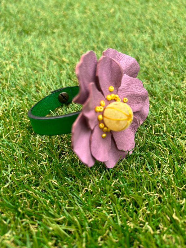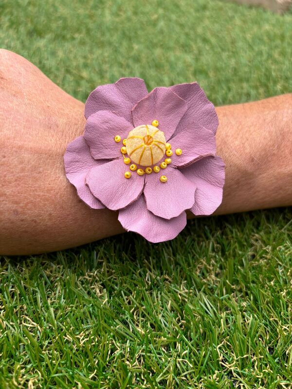 Fleur en cuir d’agneau, perle resine, perles de rocailles.