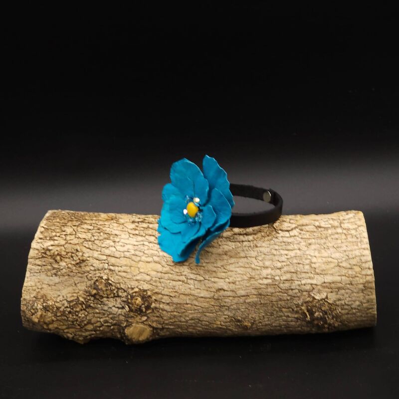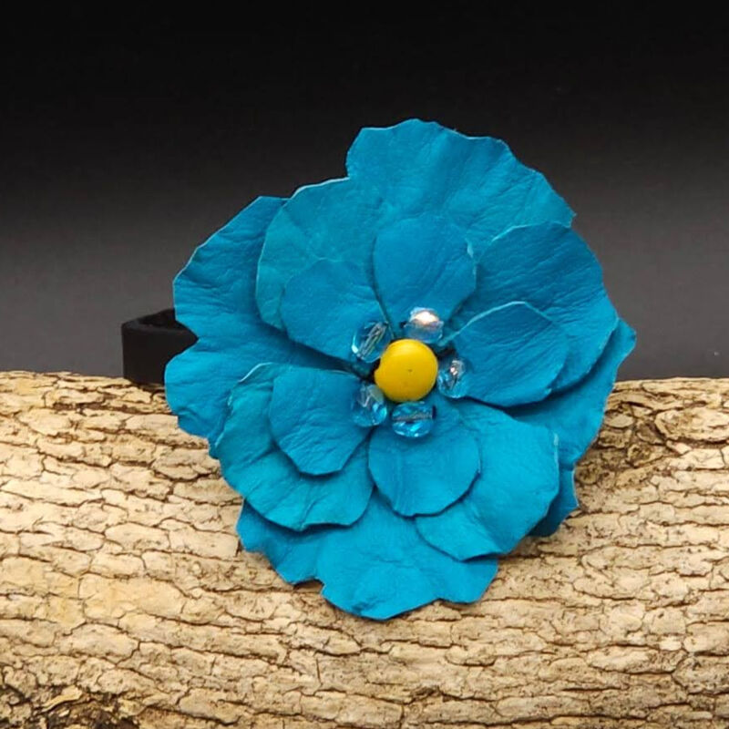Fleur en cuir d’agneau, perle résine, perles miltifacettes.