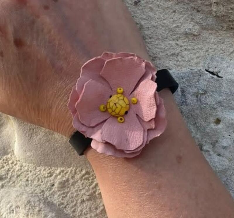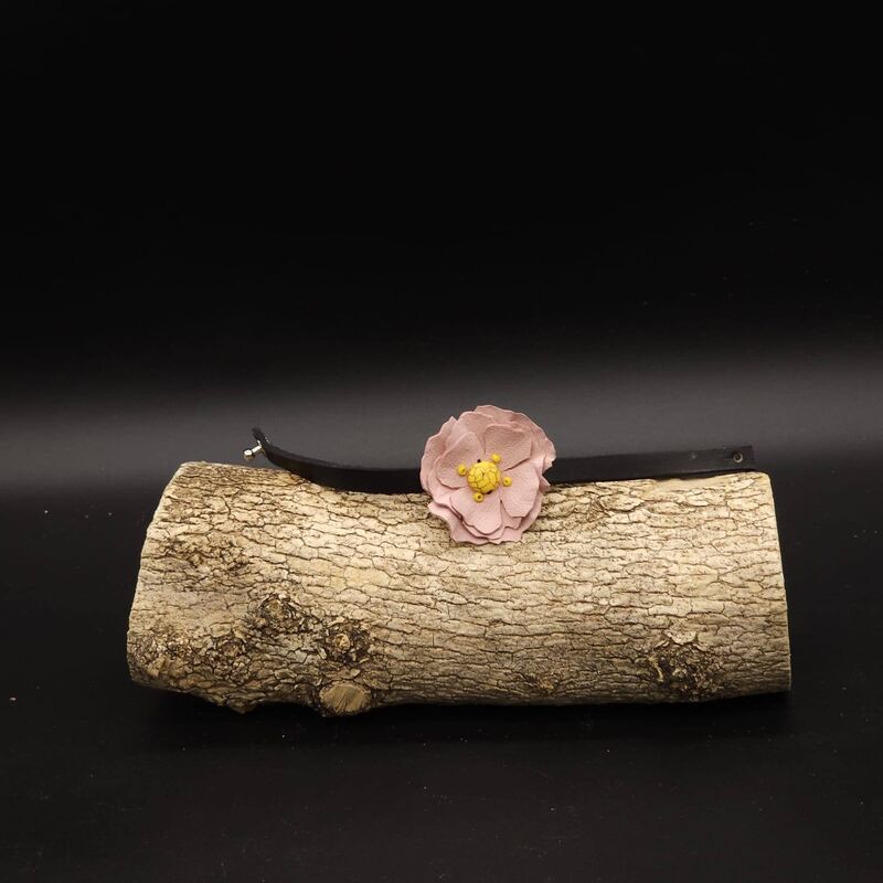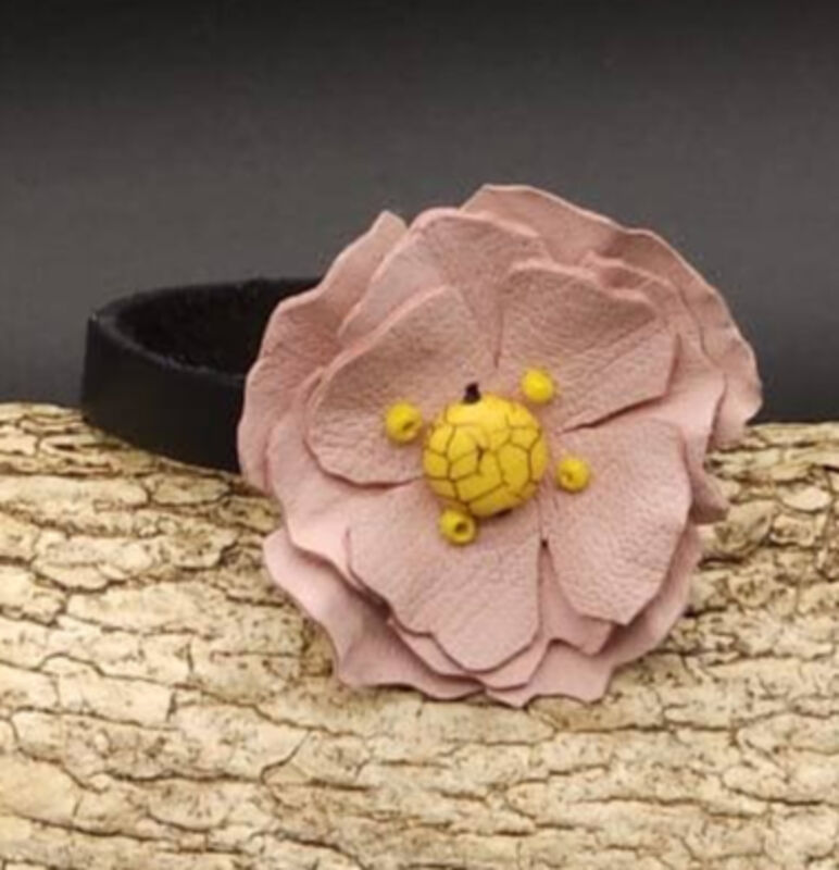 Fleur en cuir de chèvre, perle résine, perles de rocailles.