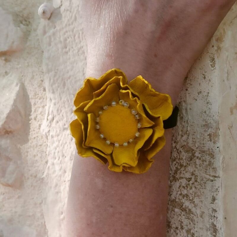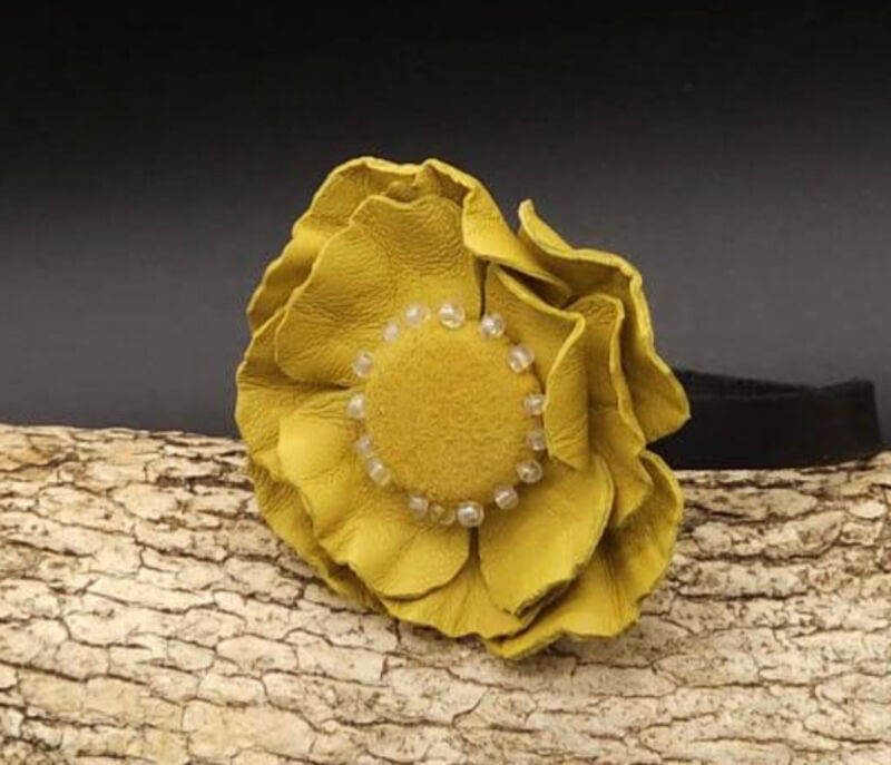 Fleur en cuir d’agneau et cuir velours, perles de rocailles.