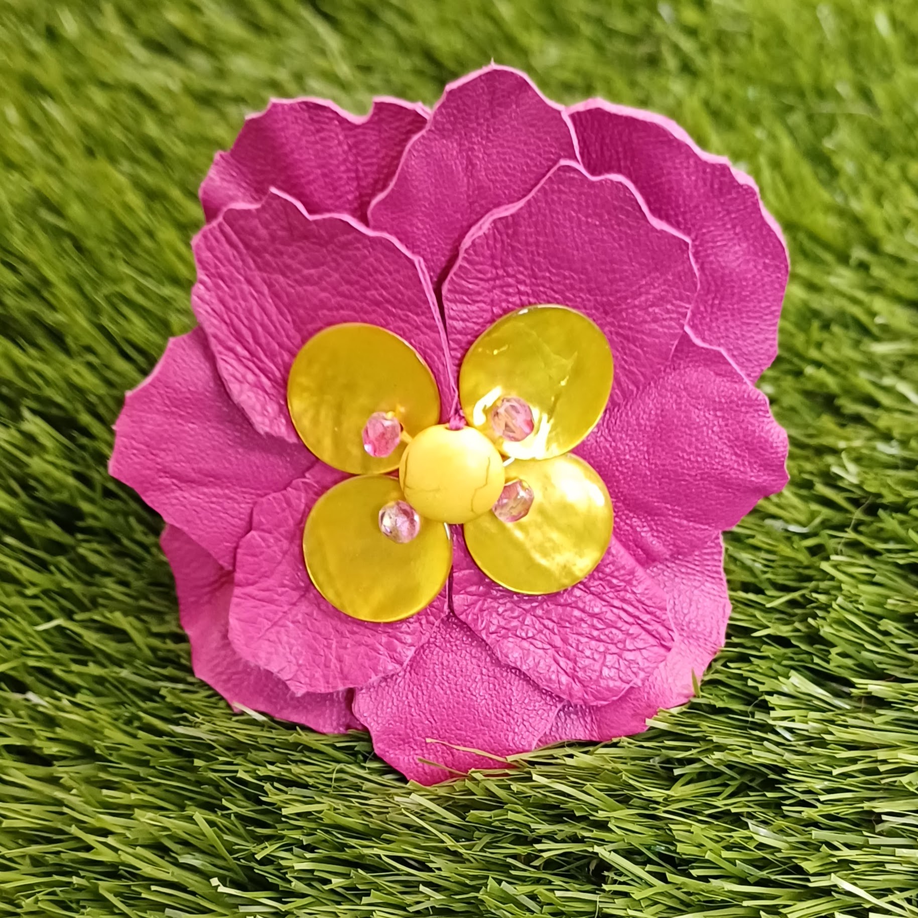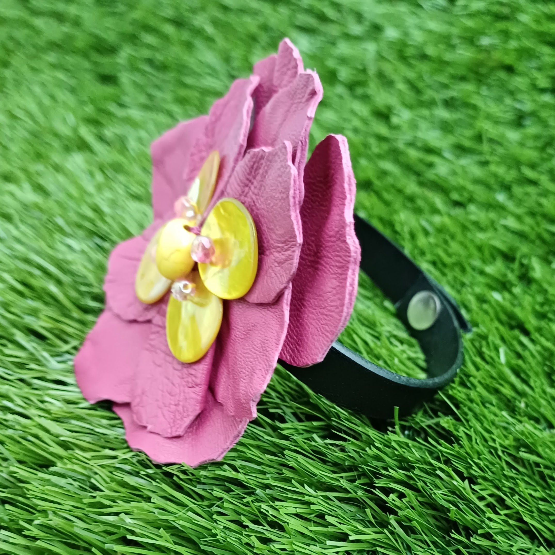 Fleur en cuir d’agneau, perle fantaisie en résine, perles de rocailles, boutons nacre.